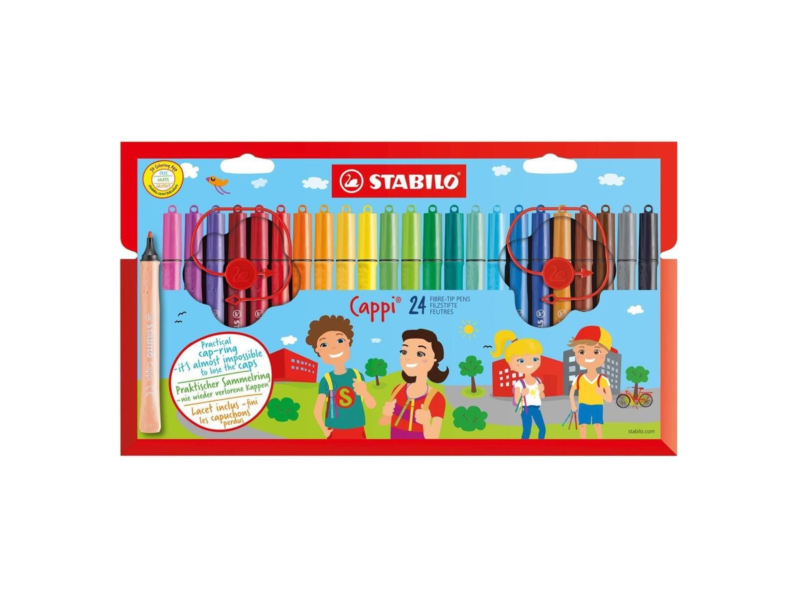 Der STABILO Cappi Filzstift im praktischen 24er Set ist die ideale Wahl für kreative Köpfe und kleine Künstler. Mit seiner einzigartigen Kappenring-Technologie kannst du die Stiftkappen einzeln auf einen cleveren Ring auffädeln, sodass sie nicht mehr verloren gehen. Die speziell entwickelte Tubenform sorgt dafür, dass der Stift nicht wegrollt und immer griffbereit bleibt. Dank der ergonomischen Griffzone liegt der STABILO Cappi optimal in der Hand, was ein müheloses Schreiben und Zeichnen ermöglicht.