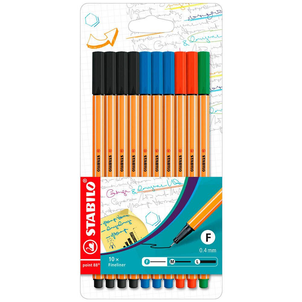 Strichbreite: 0,4 mm, metallgefasste Spitze, eckige Griffzone, Tinte auf Wasserbasis, geruchsarm, Farben: 4x schwarz, 3x blau, 2x rot und 1x grün, für Schablone und Lineale geeignet, Schreibfarbe = Schaft-/Kappenfarbe