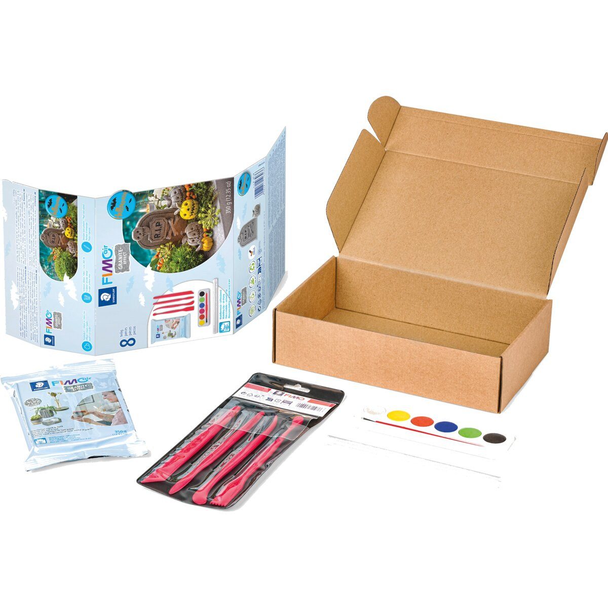 • Geschmeidige Konsistenz, Formstabil, Sofort gebrauchsfertig, Ausgehärtete Modelle können nachbearbeitet werden (feilen, schleifen, bohren, bemalen, lackieren), Kreativ-Set komplett mit Zubehör und ausführlicher Schritt-für-Schritt-Anleitung, Ideal für Einsteiger und Hobbykünstler, Spielend leicht zauberhafte Unikate modellieren, Modellieren ohne Brennofen, FIMOair 81 Set -Halloween- in einer Kartonbox beinhaltet FIMOair granite-effect Modelliermasse 350 g, 1 Malkasten mit 6 Farben inkl