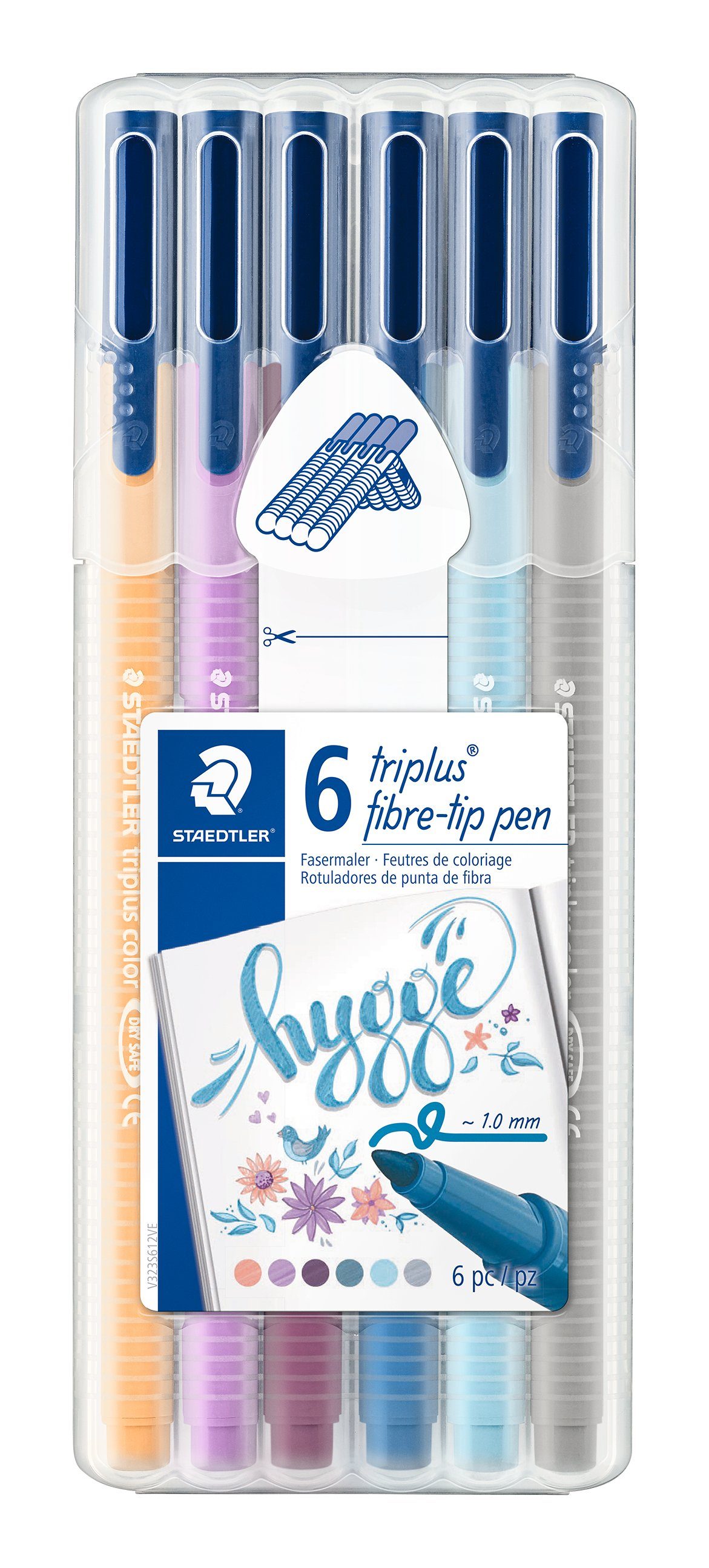 STAEDTLER Fasermaler triplus 1,0 'Hygge' auf Wasserbasis und Dreikantschaft für entspanntes Schreiben. Die Strichstärke von 1,0 mm ermöglicht feine Linien, die ideal für filigrane Motive und Handletteringschriften geeignet sind. Auswaschbar aus den meisten Textilien. 6 Stück in praktischer Aufstellbox.