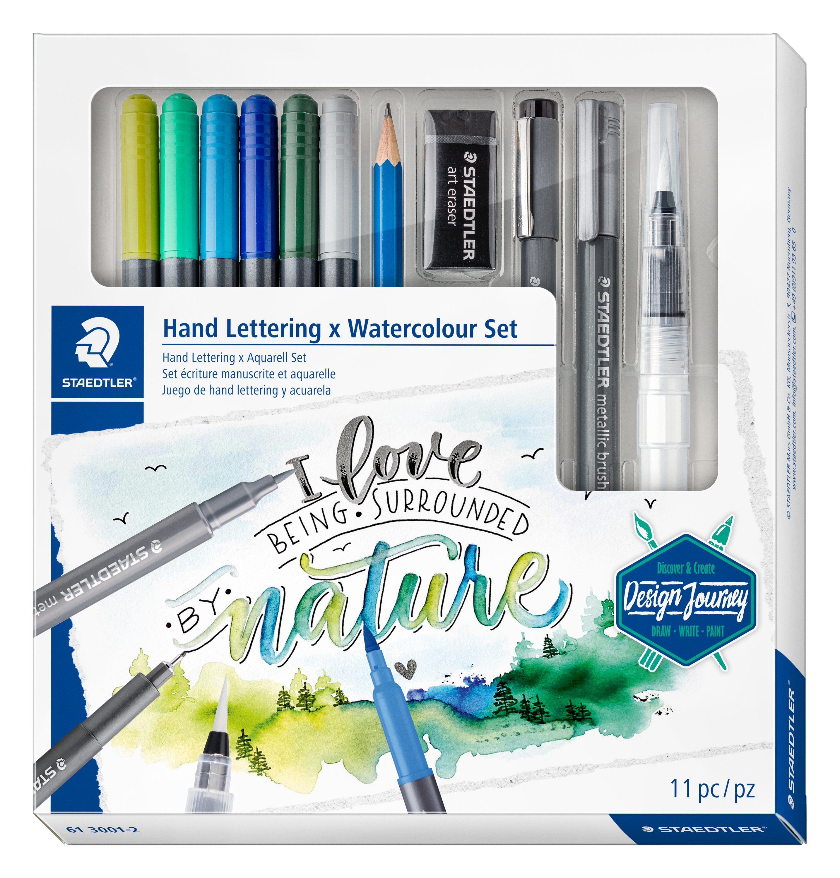 STAEDTLER Aquarell-Set 'Handlettering' mit 10 Stiften und einem Radiergummi für einzigartige Aquarellkunstwerke. Die aufeinander abgestimmten Farben sind perfekt für Naturbilder von Seen, Wäldern, Bergen und weitere außergewöhnliche Kunstwerke mit Brushpens und Wasserpinsel.