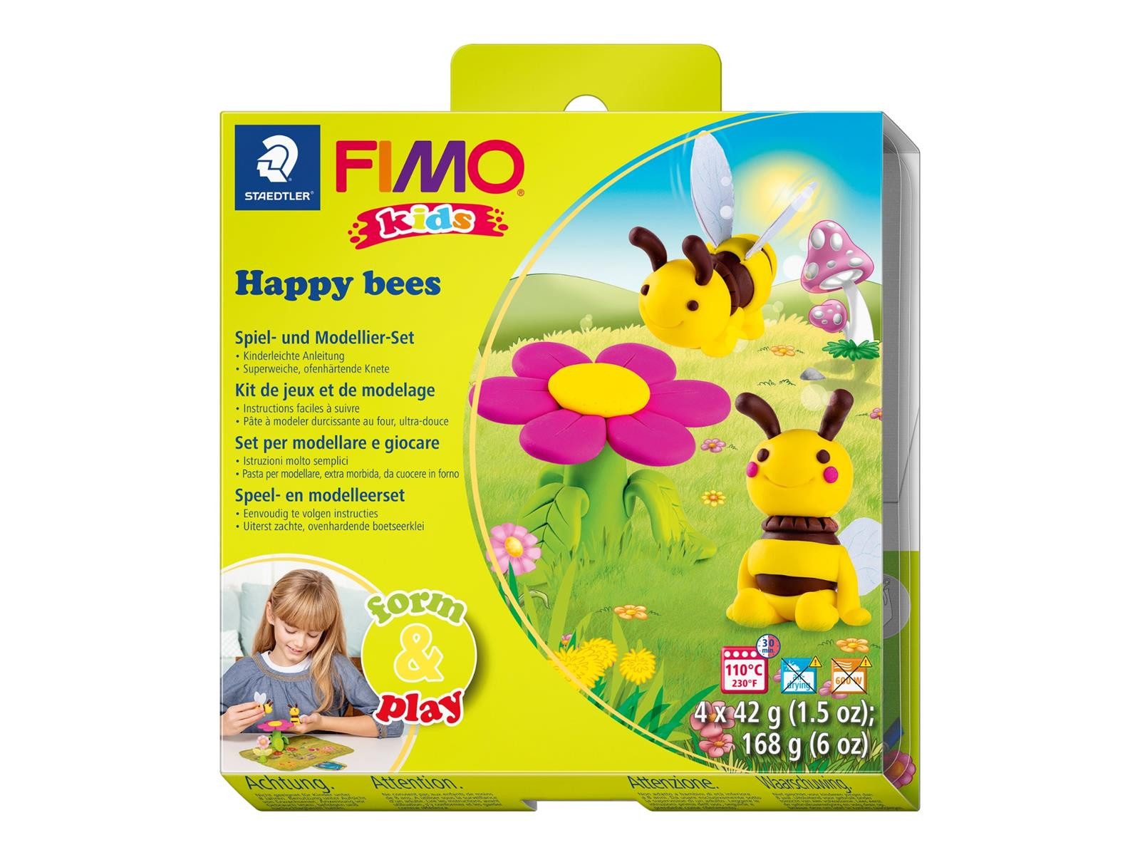 Das FIMO® kids Set „Happy Bees“ aus der form&play-Serie verbindet das Modellieren mit fantasievollem Spielen und bietet kreativen Bastelspaß für Kinder. Mit vier ofenhärtenden Blöcken (je 42 g) in Gelb, Hellgrün, Pink und Braun und einem Modellierstab können fröhliche Bienenszenen gestaltet werden. Die leicht verständliche Schritt-für-Schritt-Anleitung und der dekorative Spieluntergrund sorgen für kreatives Vergnügen. Lustige Aufkleber und Bastelbögen steigern den Spielwert. Diese weiche Modelliermasse fördert Feinmotorik, Kreativität und Fantasie. Verpackt in einer praktischen Aufhänge- oder Aufstellverpackung – ideal zum Sammeln und Aufbewahren.