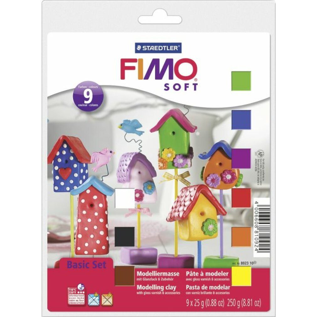 FIMO® soft 8023 Ofenhärtende Modelliermasse Basic Set im Klappblister mit 9 Halbblöcken 25 g , 1 Fläschchen Glanzlack, 1 Modellierstab, 1 Modellierunterlage, Gebrauchsanleitung. Verschiedene Sets und Materialpackungen. Speziell für Einsteiger und Hobbykünstler. Weich und geschmeidig. Bis zu 24 leuchtende Farben. Compatible with FIMO® effect and FIMO® professional. Leicht zu öffnen. Grenzenlose Vielseitigkeit: Für Schmuck, Accessoires und Home Deko.Nicht über 130°C erhitzen. FIMO ist kein Spielzeug. Verpackung für Rückfragen aufbewahren.