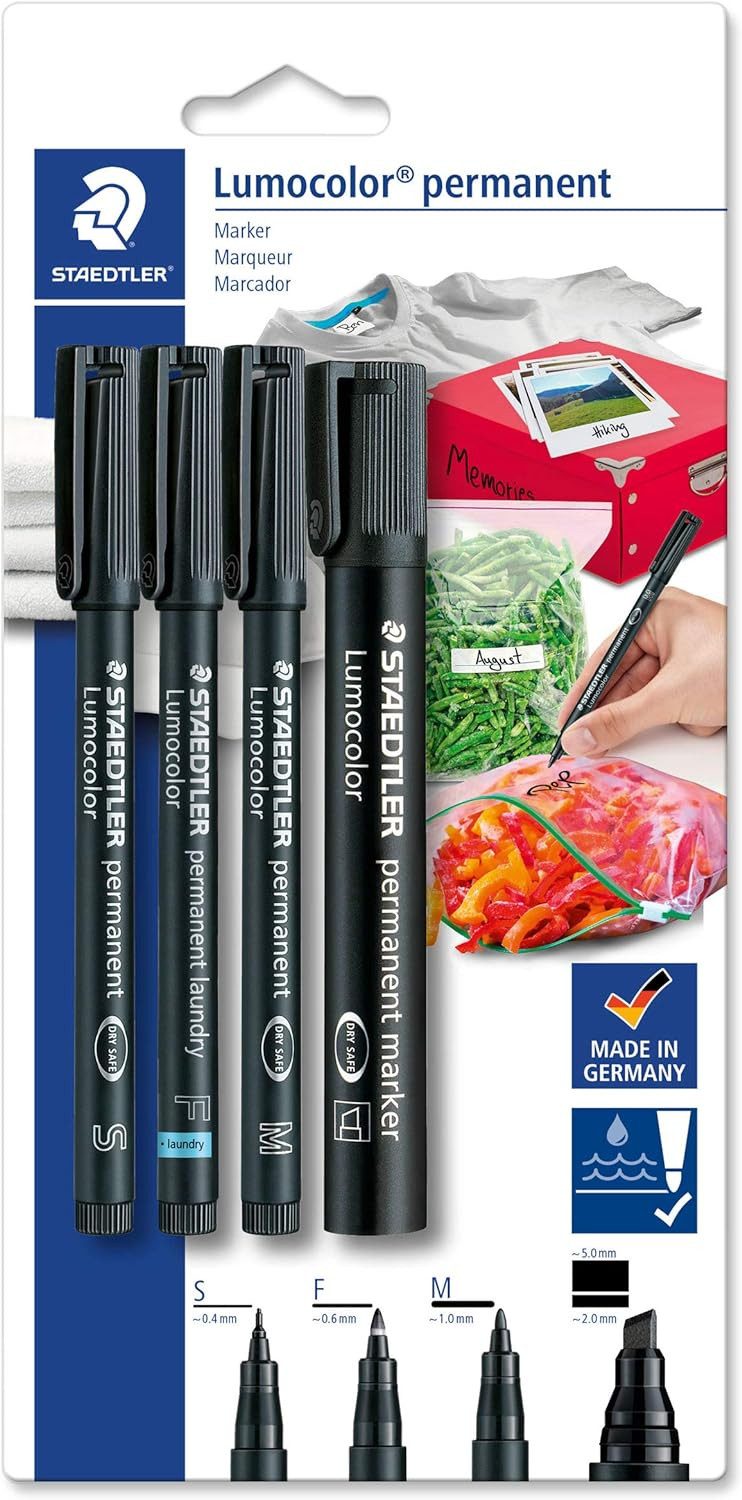 Praktisches Stifte-Set mit unterschiedlichen Strichstärken Zur dauerhaften Beschriftung von vielen Materialien geeignet Mit Austrocknungsschutz bei offener Kappe Für feine Linien und breite Striche Mit permanenter, wisch- und wasserfester Tinte 4er-Pack Permanent-Marker »Lumocolor permanent«, 4 Stifte in einem Set: 1x CD/DVD-Marker »Lumocolor« (Strichbreite S = 0,4 mm), 1x Universalmarker »Lumocolor Permanent« (Strichbreite F = 0,6 mm), 1x Universalmarker »Lumocolor Duo Permanent« (Strichbreite M und F: zwei verschiedene Spitzen in einem Marker) und 1x Universalmarker »Lumocolor Permanent« (Keilspitzen-Strichbreite: 2-5 mm / XB), Ausführung: permanente Tinte, DRY SAFE Protection schützt vor Austrocknen bei offener Kappe, wasserfest, wischfest, Schreibfarbe: schwarz