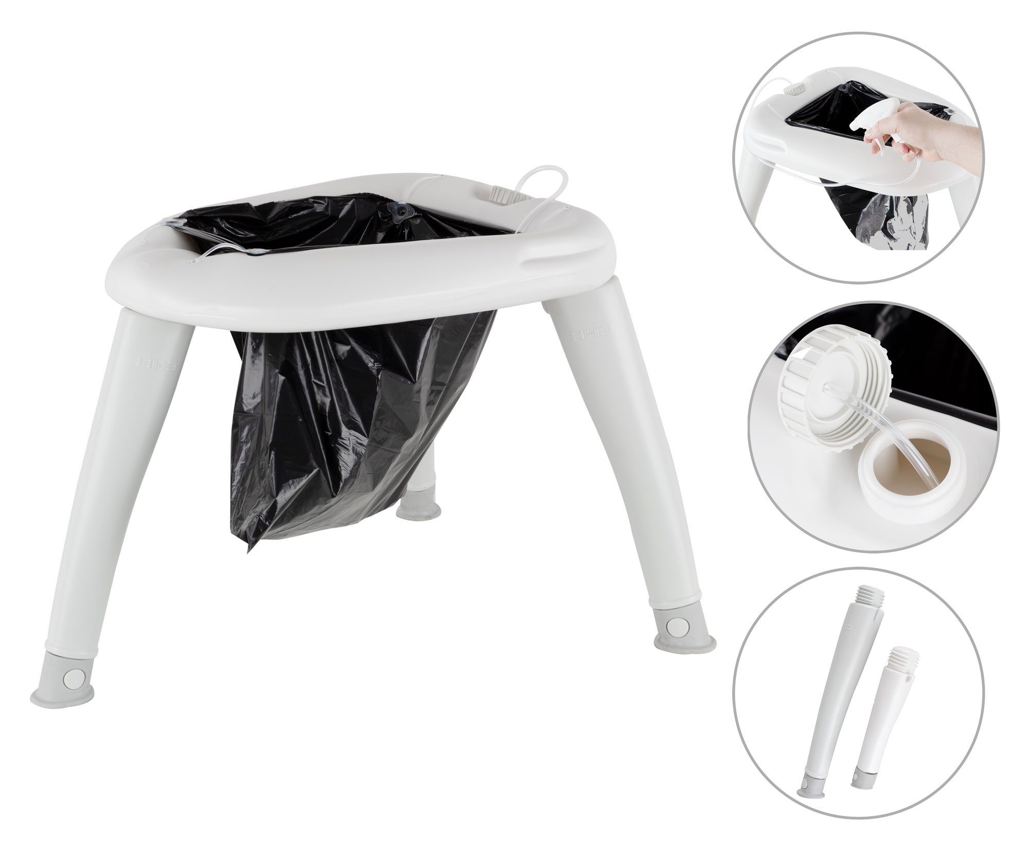 Das Quixie besteht aus stabilem, leicht zu reinigendem Kunststoff und kann in einer Minute zusammengebaut werden. Füße in zwei verschiedenen Длинаn bieten optimale Sitzhöhen (43 cm und 28 cm) für Erwachsene und Kinder. Als Auffangbehälter kann jeder Müllbeutel mit einer Mindestbreite von 50 cm (und ausreichendem Fassungsvermögen) dienen. Die Beutel können ohne jegliches Werkzeug festgeklemmt und anschließend wieder entfernt werden.