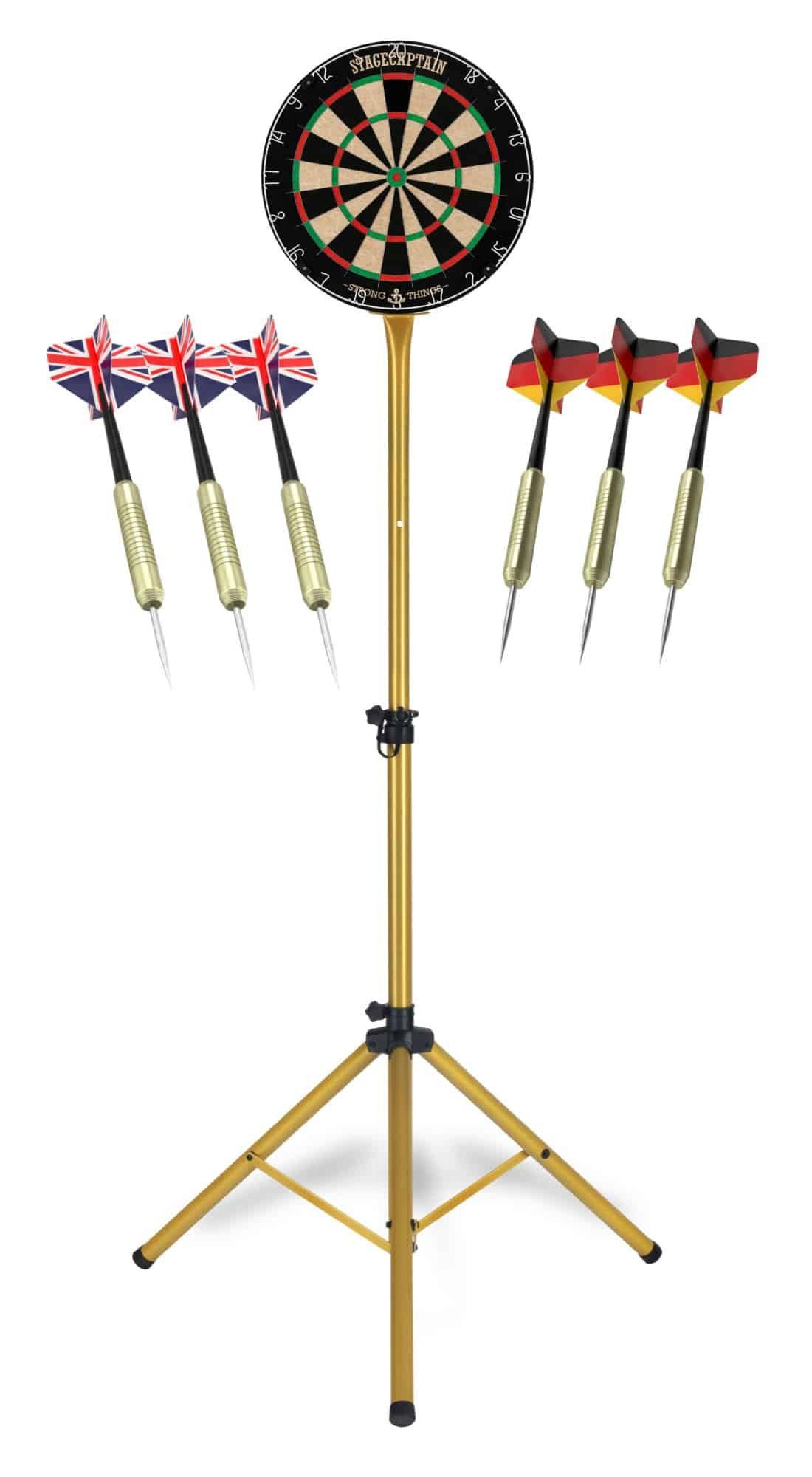 Lieferumfang | Steeldart Scheibe 6 Dartpfeile 12 Flights Wandbefestigung 1 Gold Stativ 1 Dartboard Adapter |