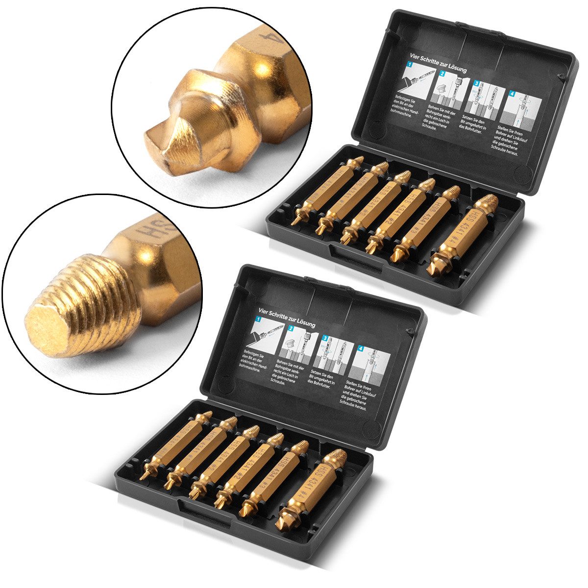 Die hochwertig gefertigten Ausdreher besitzen eine Schäl- und eine Ausdrehspitze an jedem Bit und lassen sich mit handelsüblichen Akkuschraubern oder Bohrmaschinen mit Rechts-links-Lauf benutzen.