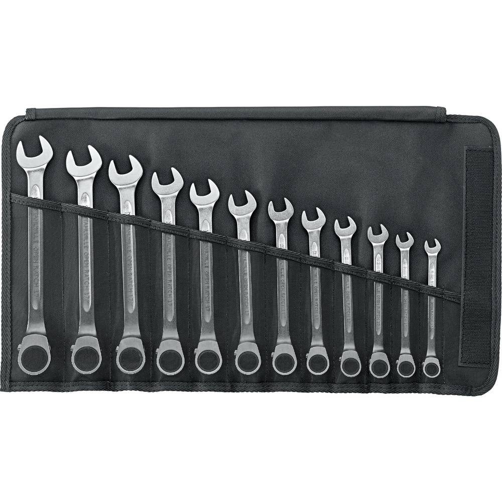 Praxisgerechte Zusammenstellung Der Ratschenringmaulschlüssel-Satz enthält die gängigsten Schlüsselgrößen von 8 bis 19 mm und deckt damit ein breites Spektrum von Einsatzmöglichkeiten ab. Die Maulöffnung ist um 15° geneigt, wodurch sie exakt an den Schrauben anliegt und somit eine optimale Kraftübertragung gewährleistet. Die integrierte Feinzahnratsche mit einem geringen Rückholwinkel ermöglicht ein schnelles und effizientes Anziehen der Schrauben, ohne dass der Schlüssel abgesetzt werden muss. Hochwertige Verarbeitung Die Schraubenschlüssel sind aus hochwertigem Chrome Alloy Steel geschmiedet, was ihnen auch im Dauereinsatz eine hohe Stabilität und Widerstandsfähigkeit verleiht. Sie sind zusätzlich korrosionsbeständig verchromt. Rutschhemmende Oberfläche Die STAHLWILLE Schraubenschlüssel verfügen über eine hochwertige und griffige Oberflächenstruktur, die ein sicheres Arbeiten selbst mit öligen Händen ermöglicht. Die rutschfeste Beschaffenheit erhöht die Kontrolle bei der Handhabung. Organisierte Aufbewahrung Das Set findet seinen Platz in den Einsteckfächern einer praktischen Rolltasche. Dadurch lässt es sich bequem und platzsparend überall mitführen. Durchsichtige Netzeinsätze ermöglichen einen schnellen Überblick über die Vollständigkeit deines Werkzeugs..