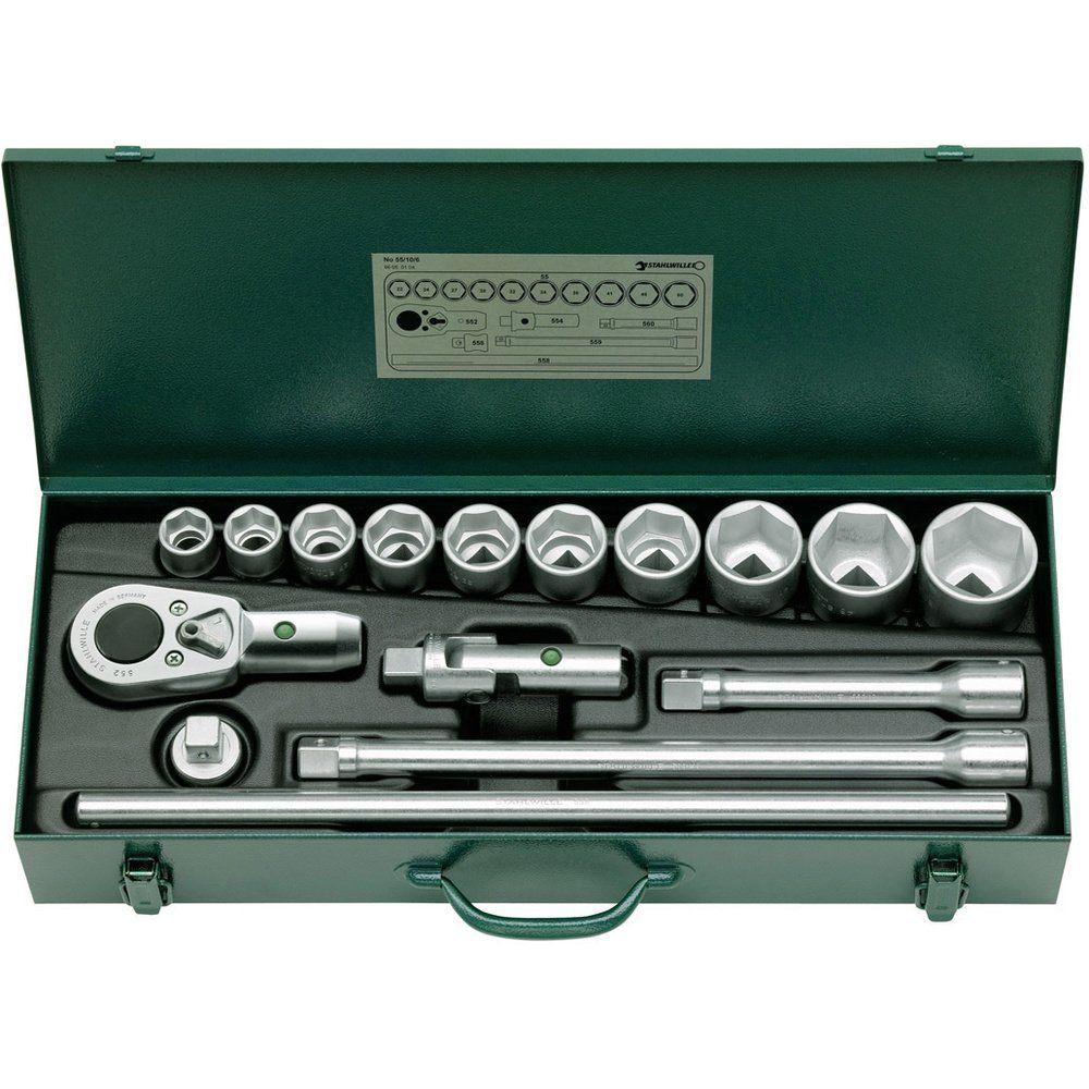 16teilige Steckschlüssel-Garnitur, Ausführung 3/4" Vierkant, im stabilen Stahlblechkasten