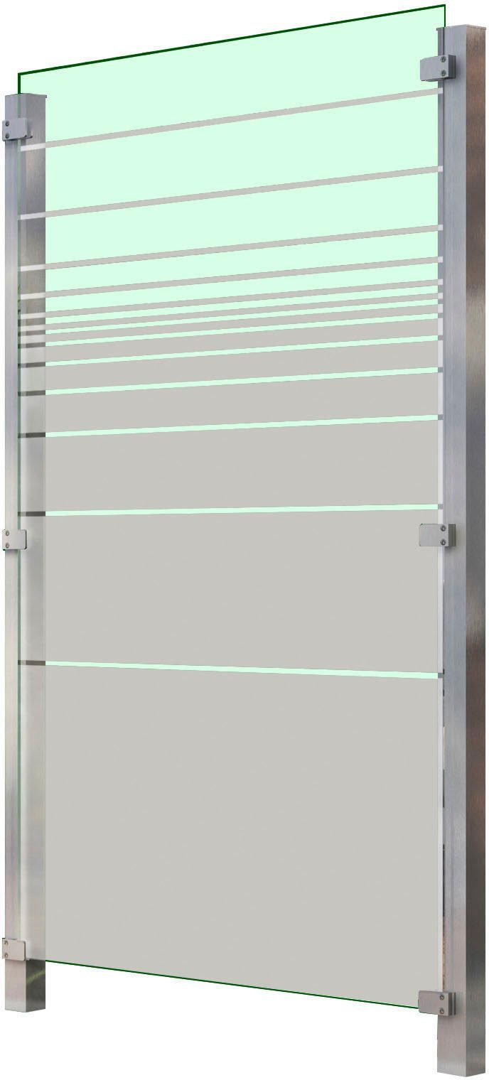Lieferumfang | 1-Mal Anfangspfosten-Set zum Einbetonieren 2170 mm V2A UND 1-Mal Endpfosten-Set zum Einbetonieren 2170 mm V2A UND 1-Mal Klarglas mit Dekor 81 Satinato 1800 x 1030 x 8 mm |