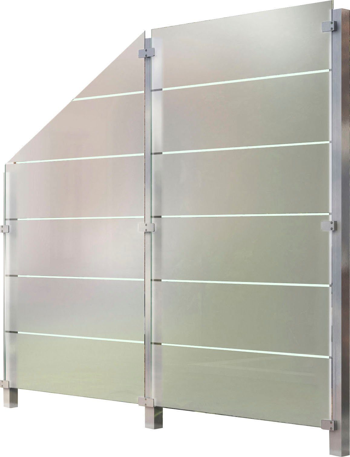 Lieferumfang | 1-Mal Anfangspfosten-Set zum Anschrauben 1870 mm V2A UND 1-Mal Mittelpfosten-Set zum Anschrauben 1870 mm V2A UND 1-Mal Endpfosten-Set zum Anschrauben 1270 mm V2A UND 3-Mal Abdeckkappe unten V2A UND 1-Mal Klarglas mit Dekor 82 Satinato 1800 x 1030 x 8 mm UND 1-Mal Klarglas mit Dekor 82 Satinato L 1800 / R 1200 x 1030 x 8 mm inkl. Montagehilfe UND 1-Mal Div. Bestigungsmaterial (Befestigungsmaterial für Untergrund nicht enthalten) |
