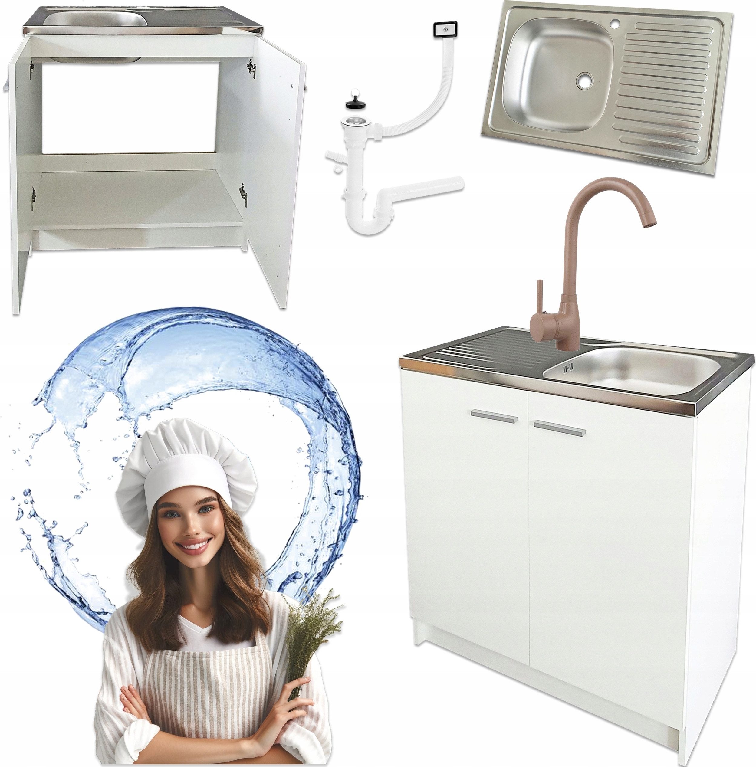 KÜCHENSCHRANK 80cm WEISS MIT SPÜLE UND ARMATUR LUNA LATTE