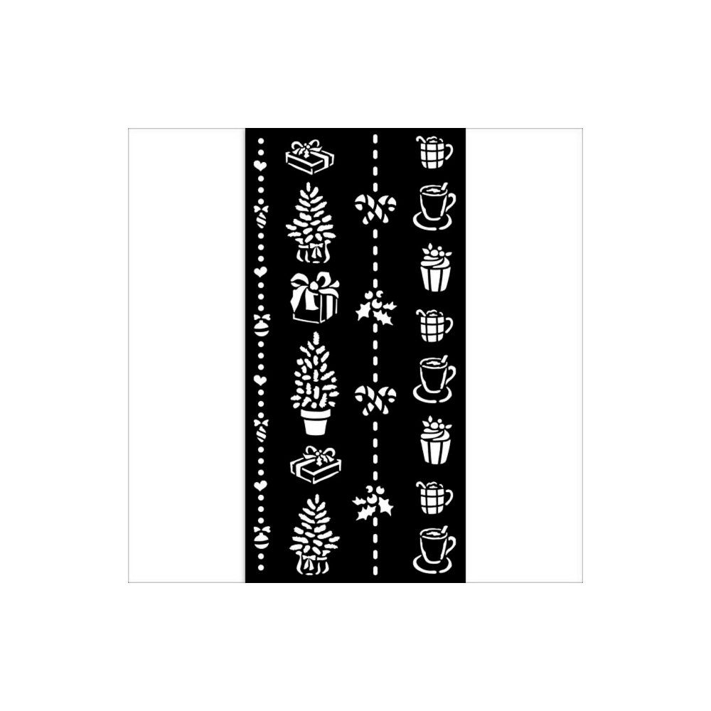 Schablone 'Weihnachtliche Ornamente', ca. 12 x 25 cm mit vier Bordüren aus weihnachtlichen Motiven wie Geschenke, Tassen, Tannenbäume, Ilex, Zuckerstangen und Co. Die Motive können auch einzeln schabloniert werden, indem die nicht benötigten Bereiche mit Krepppapier abgeklebt werden. Weihnachtsgrußkarten, Tüten, Geschenkverpackungen, Keilrahmen, Schilder und mehr werden weihnachtlich verziert. Zusätzlich ein wenig Deko-Schnee, Glitter, Schleifenband und Streuteile ergänzt, entsteht ein klasse Weihnachtsgeschenk. Ein geeigneter Haftkleber verhindert das Verrutschen der Schablone während des Schablonierens.