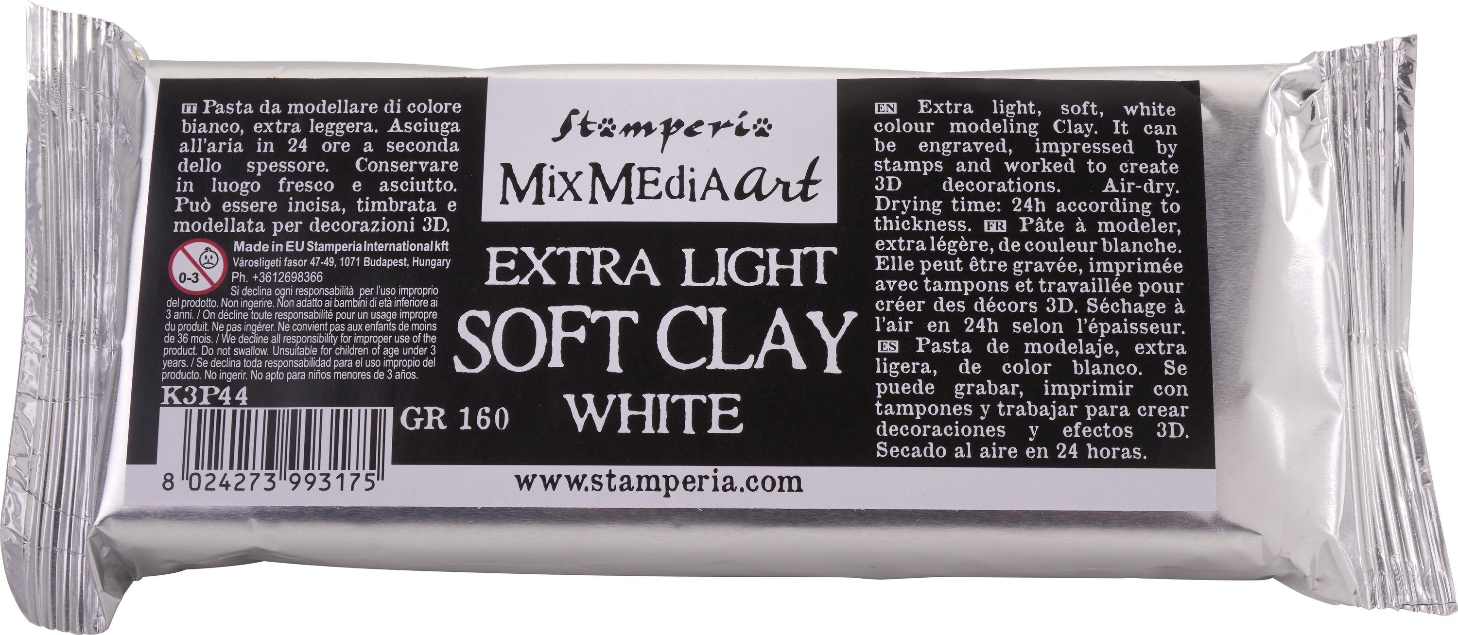 Stamperia 'Soft Clay', eine extra leichte, weiße Modelliermasse. Inhalt 160 g, lufttrocknend, Trockenzeit ca. 24 Stunden (je nach Dicke). Perfekt für die Herstellung von Embellishments, Reliefs, Blüten und mehr. Применитьe Reliefs können gestempelt, graviert oder koloriert werden. Tolle 3D-Ornamente für Geschenke, Bilder oder Holz-Dekorationen.