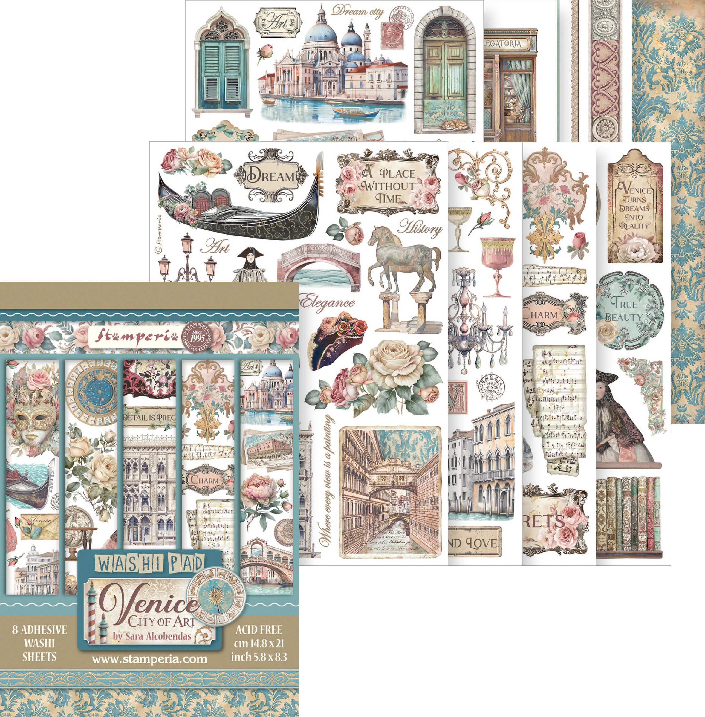 Die Washi Pad 'Venice' Aufkleber sind ideal für deine kreativen Projekte. Auf 8 Bögen durchscheinendem Washi-Papier im DIN A5 Format gedruckt, lassen sie sich leicht schneiden und haften zuverlässig auf hellen Oberflächen. Die einzigartigen Motive, inspiriert von der Kollektion Venice city of Art, umfassen Häuser, Masken, Gondeln, Brücken, Gassen, Rosen, Ornamente, Tags mit Schriftzügen und mehr, die perfekt für Scrapbookarbeiten, Grußkarten und Geschenkverpackungen geeignet sind. Dank der harmonischen Abstimmung der Kollektion kannst du individuelle Geschenk- und Deko-Ideen umsetzen. Entfessele deine Kreativität und erlebe die Vielfalt der selbstklebenden, säurefreien Washi-Sticker, die dir unzählige Gestaltungsmöglichkeiten bieten.