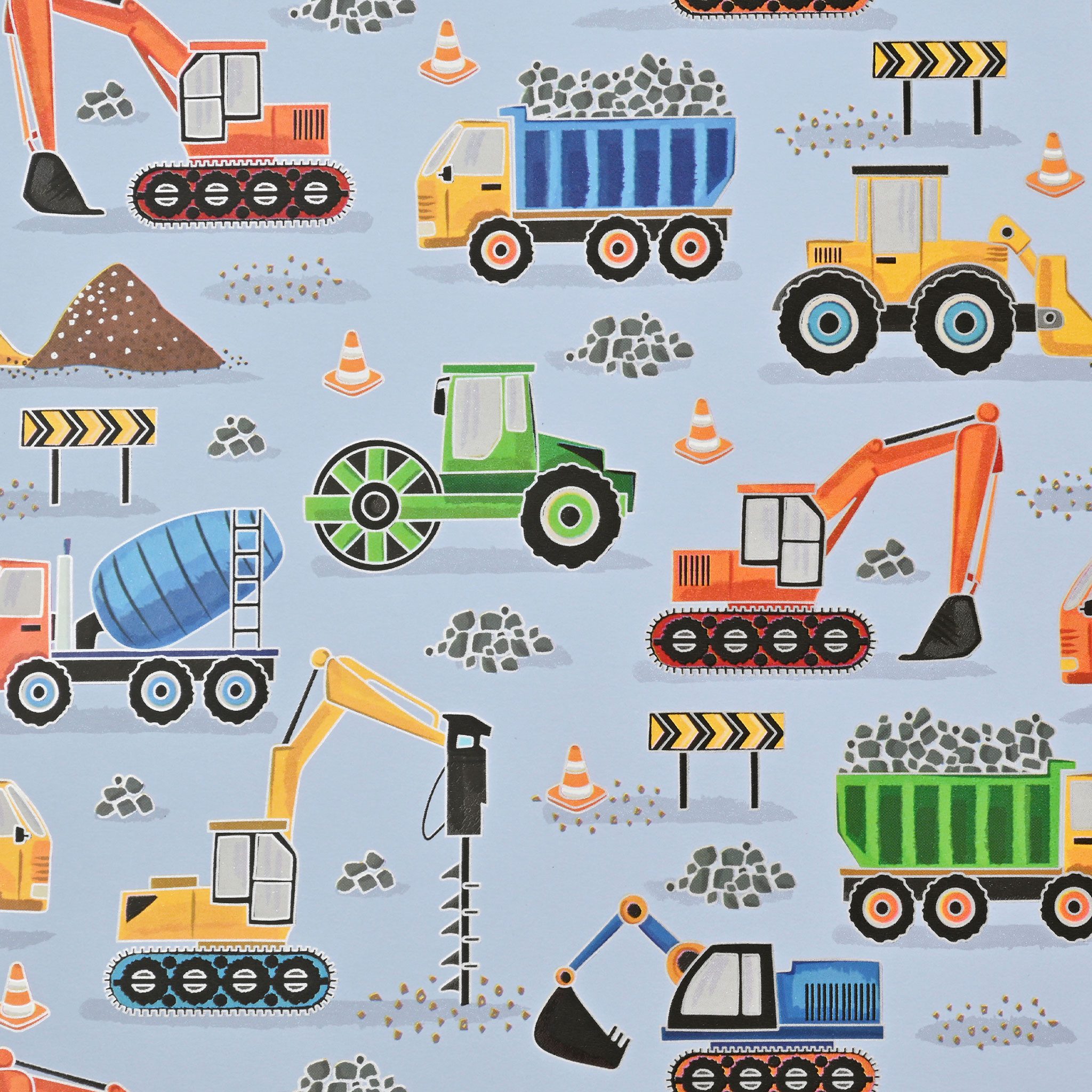 PRODUKT: Geschenkpapier mit Baustellen Motiv / GRÖSSE (BxL): 70 cm x 2 m / INHALT: 1 Geschenkpapierrolle / MATERIAL: Papier, 80 gsm, FSC zertifiziert / FARBE: blau - gelb - orange