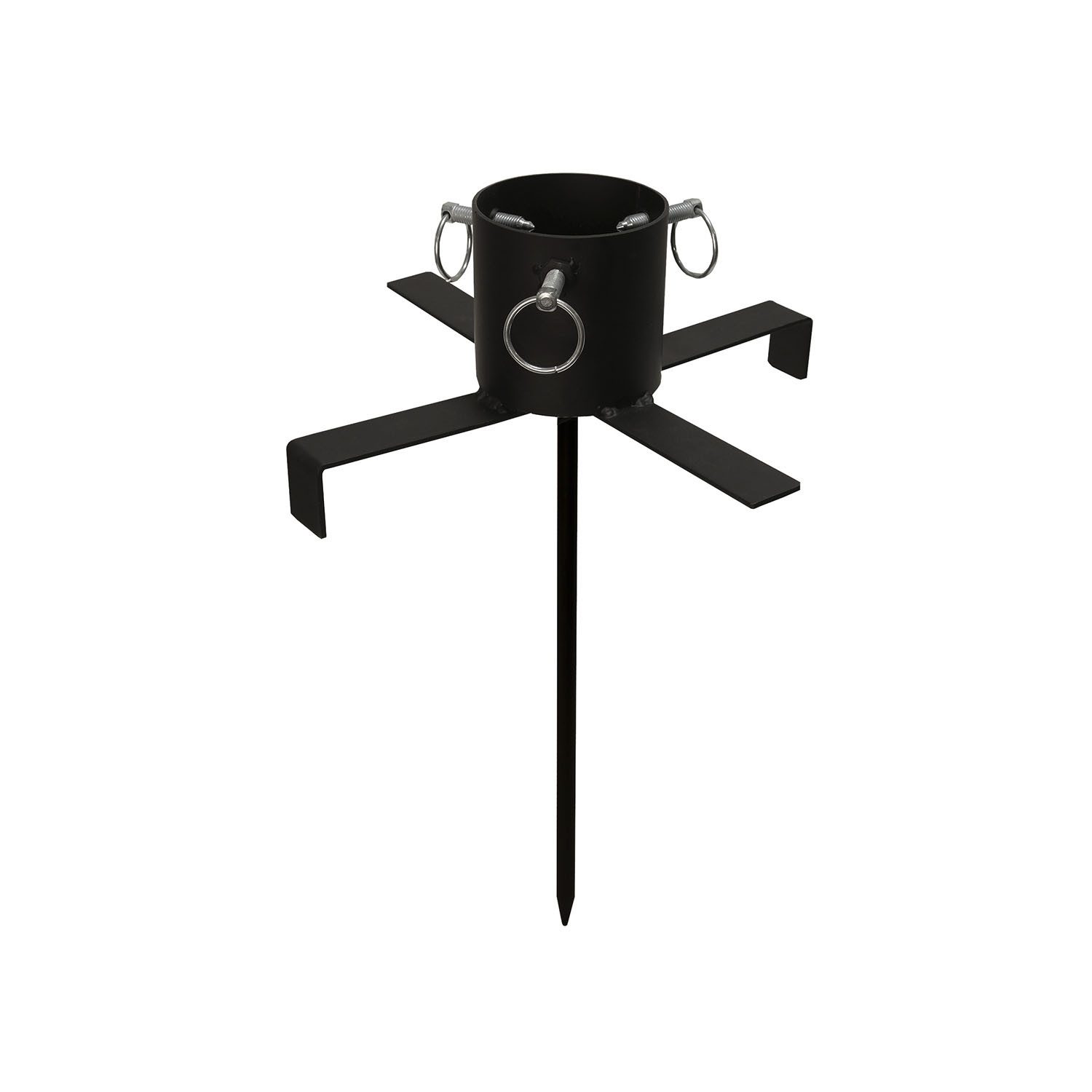 Motiv | Christbaumständer mit Erdspieß für Bäume bis 9 cm Durchmesser, schwarz, aus Metall, ideal für Garten und Vorgarten, Höhe 47 cm, Durchmesser 36 cm. |
