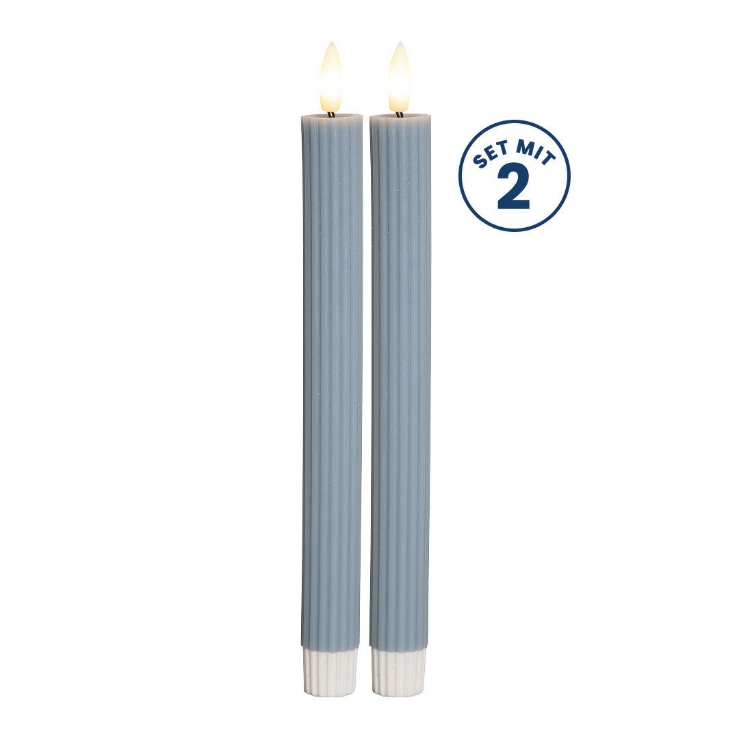Die zwei Kerzen bestehen aus taubenblauem Wachs in moderner Rillen-Optik und einer hochwertigen Kunststoff-Flamme. Die integrierten LEDs strahlen in einem angenehmen Warmweiß und haben einen Flacker-Effekt, wodurch die LED-Kerzen echten Kerzen zum Verwechseln ähnlichsehen.