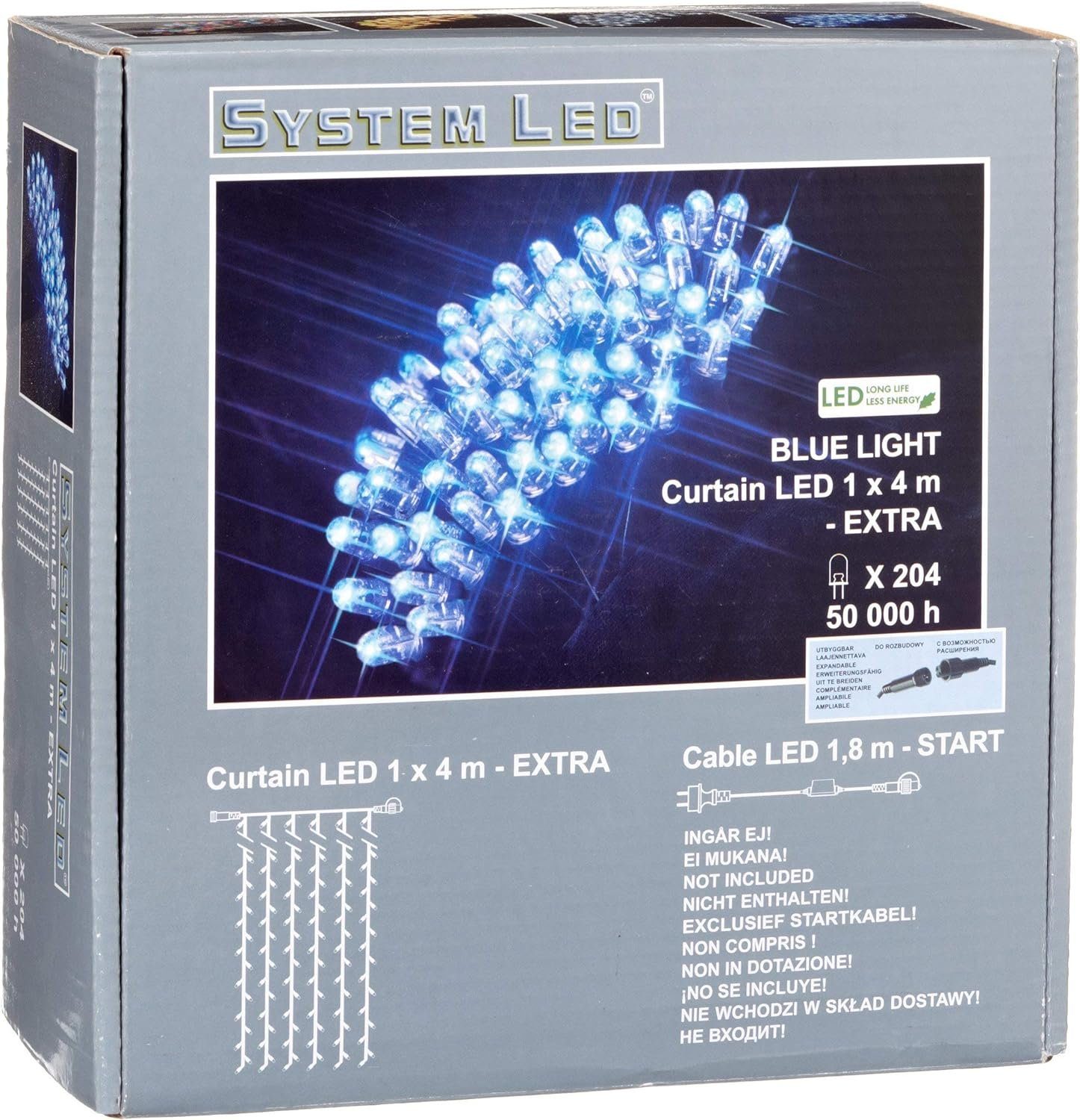 Der LED Outdoor-Vorhang SYSTEM LED besteht aus mehreren schwarzen Kabeln, an denen insgesamt 204 LEDs im Abstand von 12 cm befestigt sind. Die LEDs strahlen in einem blauen Licht und stimmen so auf die schöne Weihnachtszeit ein. Durch den Spritzwasserschutz IP44 ist außerdem ein bedenkenloser Einsatz im Außenbereich möglich. Die flexibel einsetzbare Lichterkette lässt sich durch einfaches Ineinanderschrauben mit anderen Komponenten des SYSTEM LED verbinden. Für den alleinigen Einsatz wird das Stromkabel aus demselben System benötigt, welches separat erhältlich ist. Mit einer Длина von 1 Meter und einer Höhe von 4 Metern ist der Lichtervorhang sowohl im Garten als auch im Wohnbereich einsetzbar. In jedem Fall erzeugt er ein gemütliches, festliches Ambiente in der Umgebung.