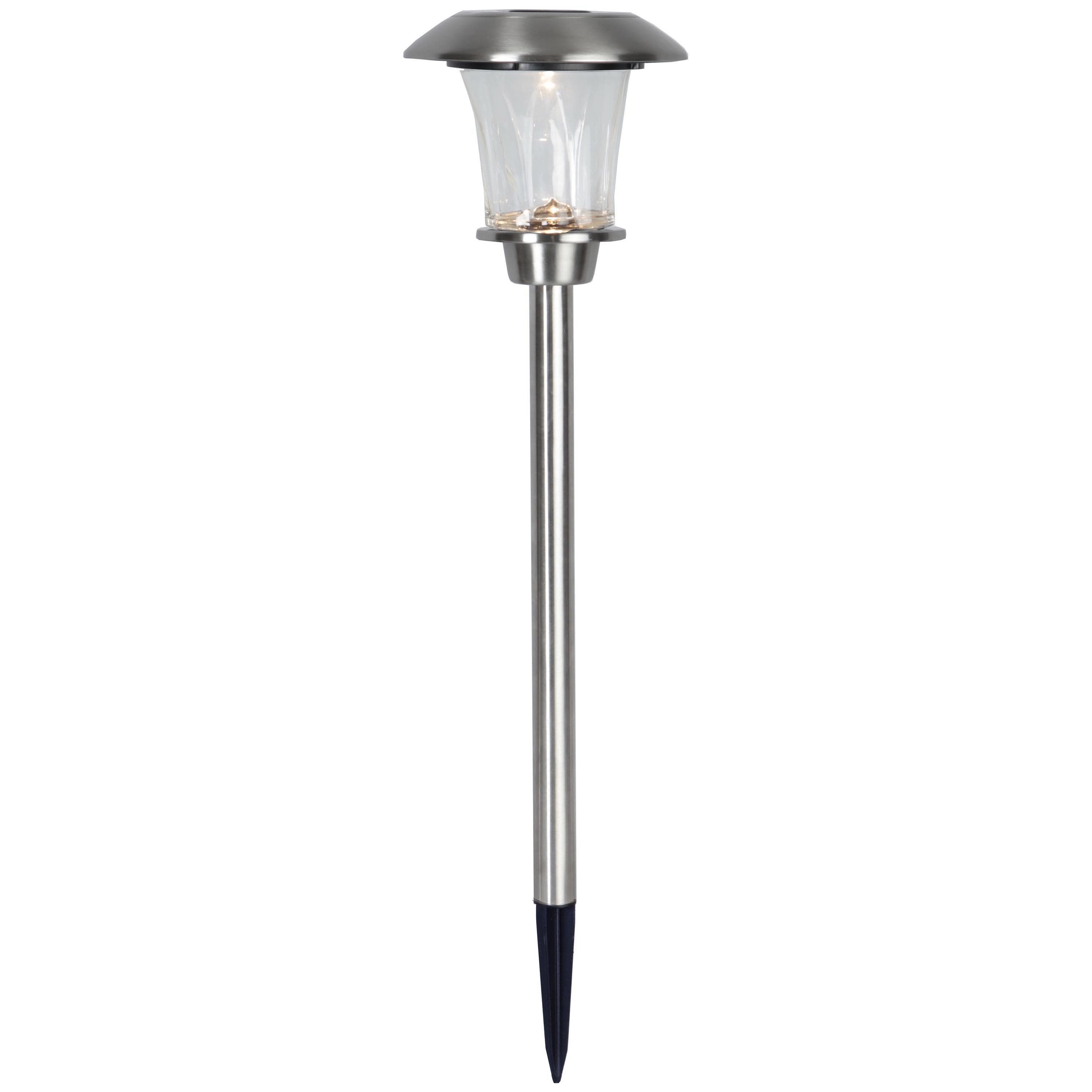 Die LED-Solar-Pollerleuchte GRANADA besteht aus einem Edelstahl-Stiel mit schwarzem Erdspieß, an dessen Spitze sich der leicht trichterförmige Leuchtenkopf befindet. Die integrierten LEDs strahlen ein angenehmes warmweißes Licht aus und schaffen so ein gemütliches Ambiente. Auf dem Leuchtenkopf befindet sich das Solarpanel, mit dem die verbaute Batterie einfach wiederaufgeladen werden kann. Durch den Dämmerungssensor schaltet sich die Solarleuchte außerdem selbstständig ein und aus. Mit einer Höhe von 48 cm und einer Breite von 15 cm eignet sich die Wegleuchte ideal als stilvolles Deko-Element für den Außenbereich, egal ob im Blumenbeet, am Wegrand für eine sichere Beleuchtung oder zum Hervorheben einzelner Garten-Elemente. Die wiederaufladbare Batterie ist im Lieferumfang enthalten.