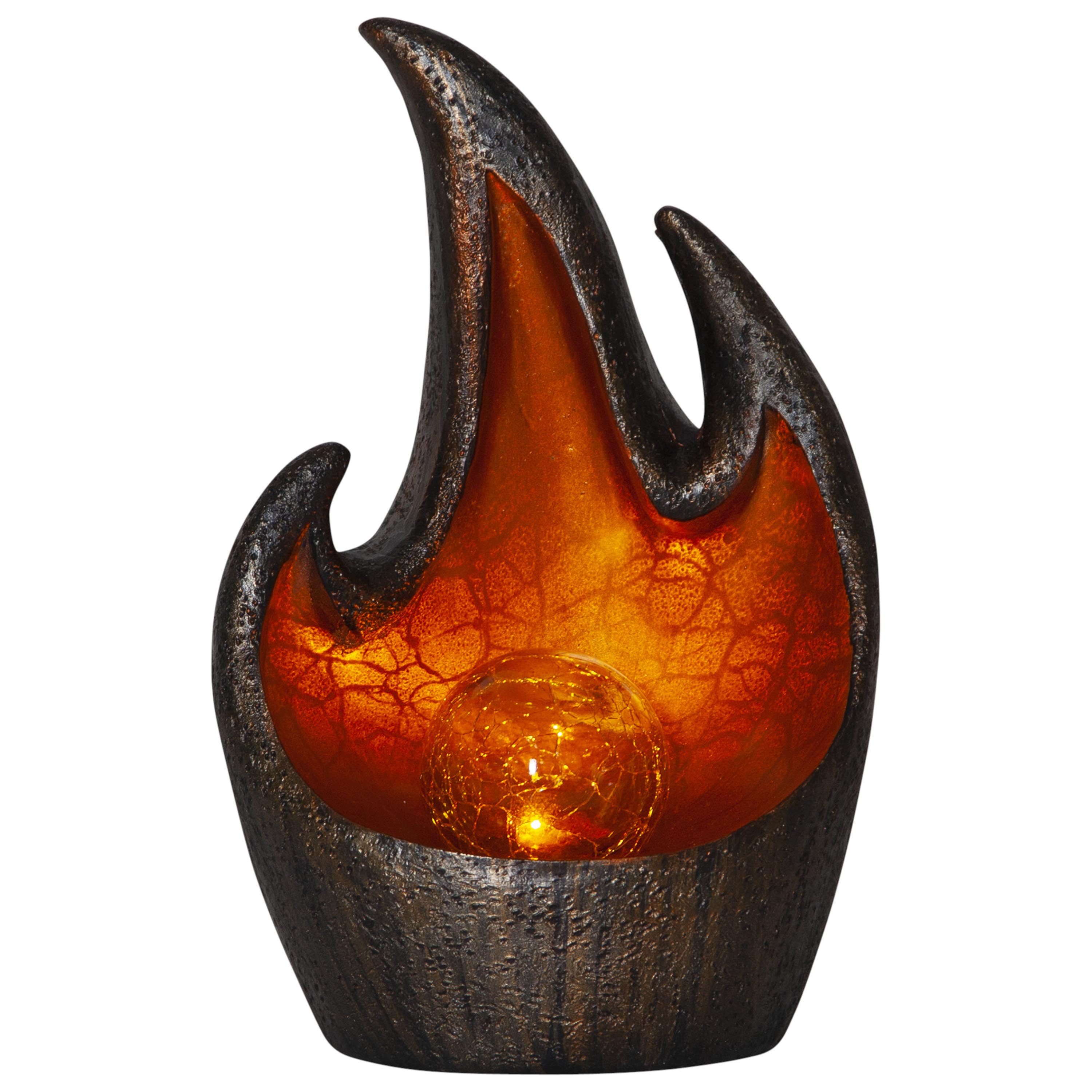 Die LED-Solardekoration MELILLA besteht aus einem bronzefarbenen, flammenförmigen Korpus mit bernsteinfarbener Füllung, in dessen Mitte sich eine bernsteinfarbene Kugel mit Riss-Optik befindet. Die integrierte LED strahlt ein ebenfalls bernsteinfarbenes Licht aus und verstärkt so den Flammencharakter. Das verbaute Solarpanel sammelt tagsüber Energie und speichert diese in einer Batterie. Sobald es dunkel wird schaltet sich die Deko-Leuchte über den Dämmerungssensor automatisch ein und sorgt für eine gemütliche Beleuchtung im Freien. Mit den Maßen 25 x 16 x 11 cm eignet sich die Solarflamme ideal zur stilvollen Dekoration des Außenbereichs. Sie kann sowohl auf einem Beistelltisch auf der Terrasse, als auch freistehend im Garten platziert werden und dort ihren unverwechselbaren Charme versprühen. Die wiederaufladbare Batterie ist im Lieferumfang enthalten.
