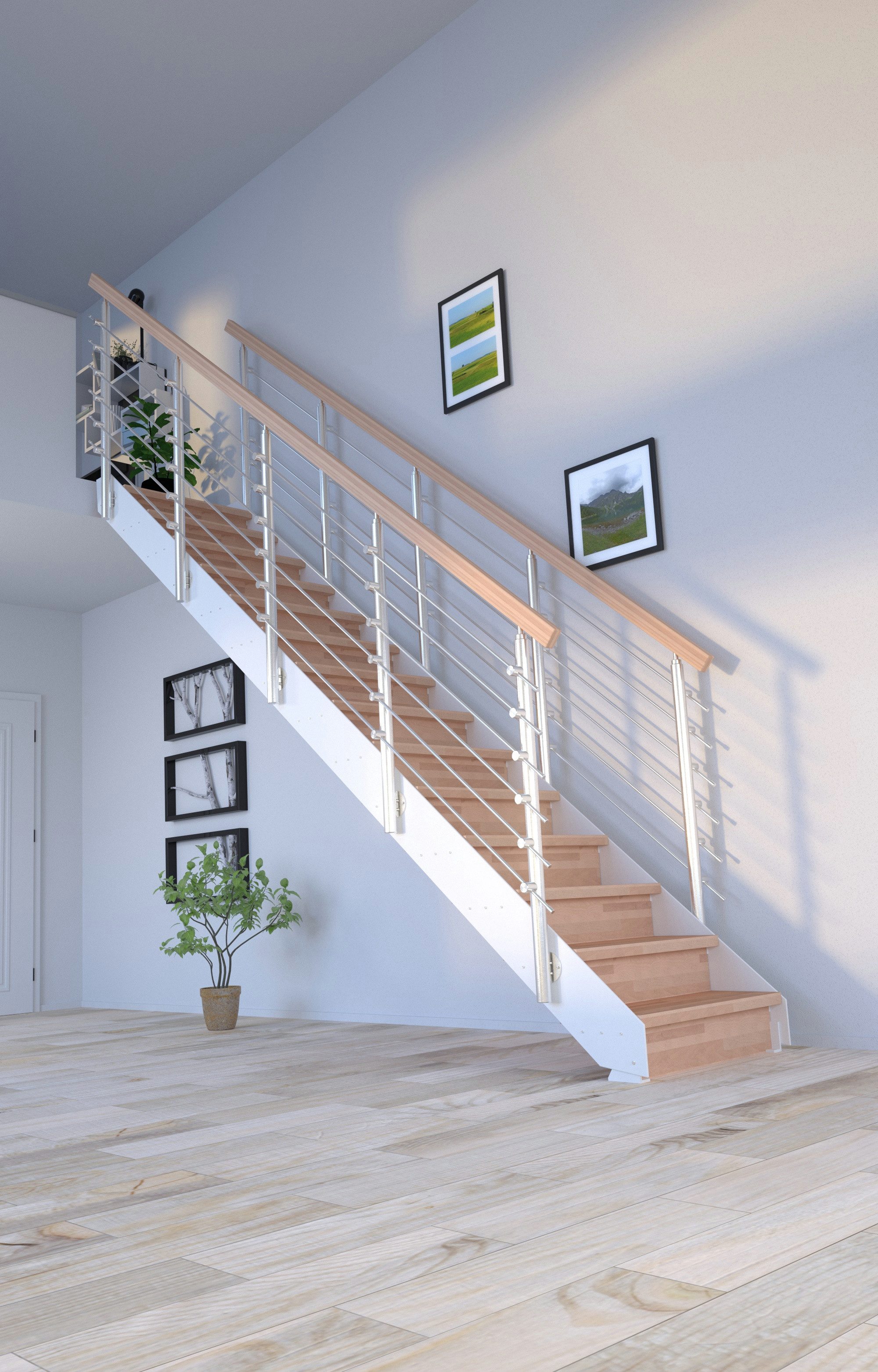 Technische Daten für das Treppenmodell Stahltreppe (Buche unbehandelt) in Weiß & Design-Geländer beidseitig & Rechteckhandlauf und - wie auf dem Foto dargestellt.