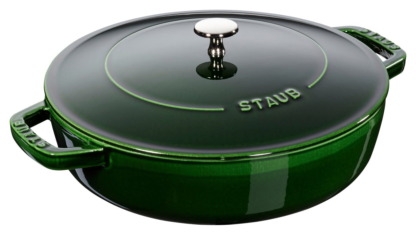 Staub Braisers Multifunktionsbräter mit Chistera Deckel, 28 cm rund Gusseisen Basilikum-Grün Mit dem runden Multifunktionsbräter von Staub gelingt Ihnen ein Braten oder auch ein vegetarisches Gericht wie ein Ratatouille besonders gut. Er ist mit einem speziellen Deckel mit der von Staub entwickelten Chistera Drop- Structure ausgestattet. Durch diese patentierte Struktur tropft der Wasserdampf, der sich an der Innenseite des Deckels sammelt, gleichmäßig auf das gesamte Gargut. Dadurch wird Fleisch besonders saftig und Gemüse erhält stets die nötige Feuchtigkeit. Der basilikumgrüne Staub-Multifunktionsbräter besteht aus emailliertem Gusseisen, das zum Schmoren von Lebensmitteln besonders gut geeignet ist, denn es speichert die Hitze effektiv und verteilt sie danach langsam und gleichmäßig auf das Bratgut. Die mattschwarze Emaillierung der Innenseite verstärkt diesen Effekt noch. Der Bräter hat einen Durchmesser von 28 cm, eine Höhe von 13 cm und fasst 3,7 l. Solch ein Bräter ist für jede Herdart inklusive Induktionsherd und für den Backofen geeignet. Gusseisen ist äußerst robust und kratzfest. Es hat außerdem einen ausgezeichneten Schmoreffekt und wird deshalb von berühmten Köchen wie Paul Bocuse und Hobbyköchen gleichermaßen geschätzt. Mit solch einem Bräter gelingen Ihnen auch als Anfänger die leckersten Gerichte. Damit zaubern Sie zum Beispiel ein köstlich geschmortes Boeuf Bourguignon, bei dem Rindfleisch in Rotwein gegart wird, und begeistern Ihre Freunde und Verwandten mit einem köstlichen Essen. Ideal zum Anbraten und langsamen Garen von Fleisch, Fisch oder Gemüse Saftiges und zartes Kochergebnis durch die spezielle Chistera-Tropfenstruktur im Deckel Die schwarzmatte Innenemaillierung eignet sich zum besonders krossen Anbraten und ist besonders strapazierfähig Für alle Herdarten inkl. Induktion geeignet, auch im Backofen/Grill einsetzbar Bodendurchmesser: 22,2 cm Breite: 28 cm Durchmesser: 28 cm Gewicht: 5,4 kg Hitzebeständigkeit: ja Höhe ohne Deckel: 7,6 cm Höhe: 12,6 cm Induktionsfähigkeit: ja Длина: 36,1 cm Volumen: 3,7 l