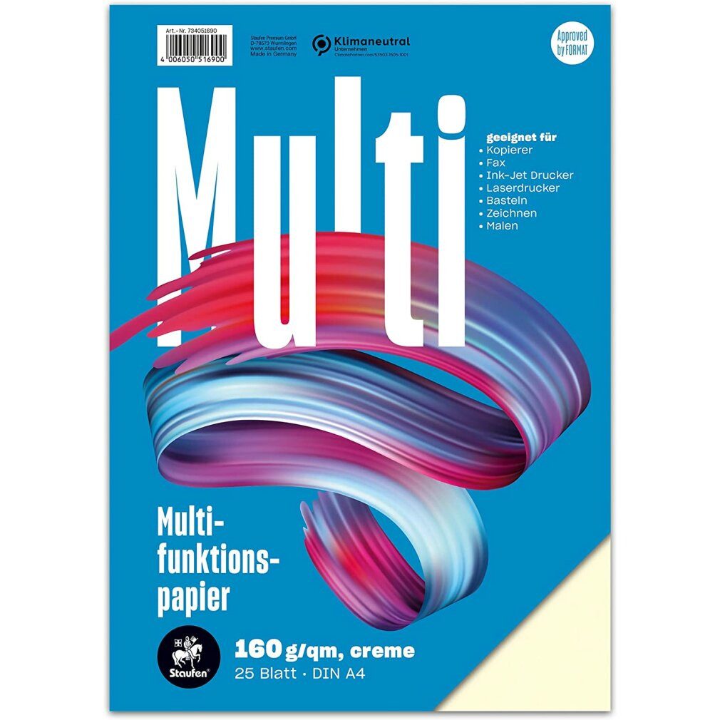 Staufen Mehrzweckpapier Allrounder in Sachen Papier: Drucken, Schreiben, Basteln. Verschiedene Farben und Stärken. Mit gutem Gewissen: Hergestellt in einem klimaneutralen Unternehmen. Allrounder für Drucker Mehrzweckpapier ist das Genie des Druckpapiers: Schwarzweiß- oder Farb-, Laser- oder Tintenstrahldrucker. Wiederverschließbare Verpackung, keine Großverpackung. Für Ihre persönlichen Projekte. Kleine Aktion, große Wirkung Schreibt jetzt noch jemand Briefe? Im Gegensatz zu Rechnungen und Massenpost im Briefkasten lieben wir alle ein paar handgeschriebene Zeilen, nicht wahr? Briefe sind beliebt, weil sie erfrischend und ein Ausdruck der Dankbarkeit sind. Na, hast du heute schon geschrieben? Dein DIY-Projekt Karten für den nächsten Geburtstag, Faltprojekte, Tischkarten für die Hochzeit? All dies ist mit Staufen-Multifunktionspapieren möglich. Es ist vielseitig und einfach zu verwenden. Bunt und individuell Die Einsatzmöglichkeiten sind nahezu grenzenlos und vielfältig. Planen, organisieren, klassifizieren,… Wofür verwenden Sie es? Vorteile von Mehrzweckpapier: Kleine Packungsgröße verschiedene Farben Beutel verschließen Hergestellt in einem klimaneutralen Unternehmen