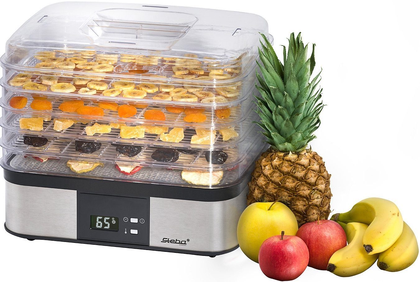 Впередe Vorteile | Auf 5 stapelbaren Klarsicht-Aufsätzen mit einer Размер von jeweils 32 x 25cm bietet der ED 5 ausreichend Platz zum Trocknen Ihrer Lieblingsfrüchte. Der langlebige Motor mit Lüfterflügeln sorgt bei 350 Watt immer für ausreichend Luftzirkulation im Gerät und garantiert damit optimale Ergebnisse. Die mitgelieferte Kräuterablagematte ist ideal zum Trocknen von Kräutern geeignet. Sie verhindert ein Durchrutschen kleiner Blätter von einer Etage zur anderen. Mit Hilfe des Timers (1 - 36 Stunden) kann die gewünschte Laufzeit immer problemlos eingestellt werden und lässt das Gerät ohne Aufsicht arbeiten. |