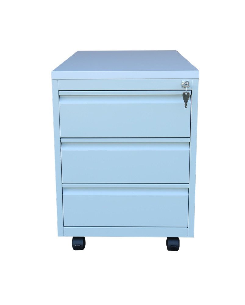 Langlebige, pflegeleichte, verschweißte Stahlkonstruktion 3 Schubladen Teleskopführungen Schubladentiefe 550 mm Griffleiste 15 mm Stahltop Zentralzylinderschloss inkl. 2 Schlüssel Lieferung: Komplett verschweißt und montiert - keine Montage erforderlich Maße: H 610 x B 460 x T 590 mm