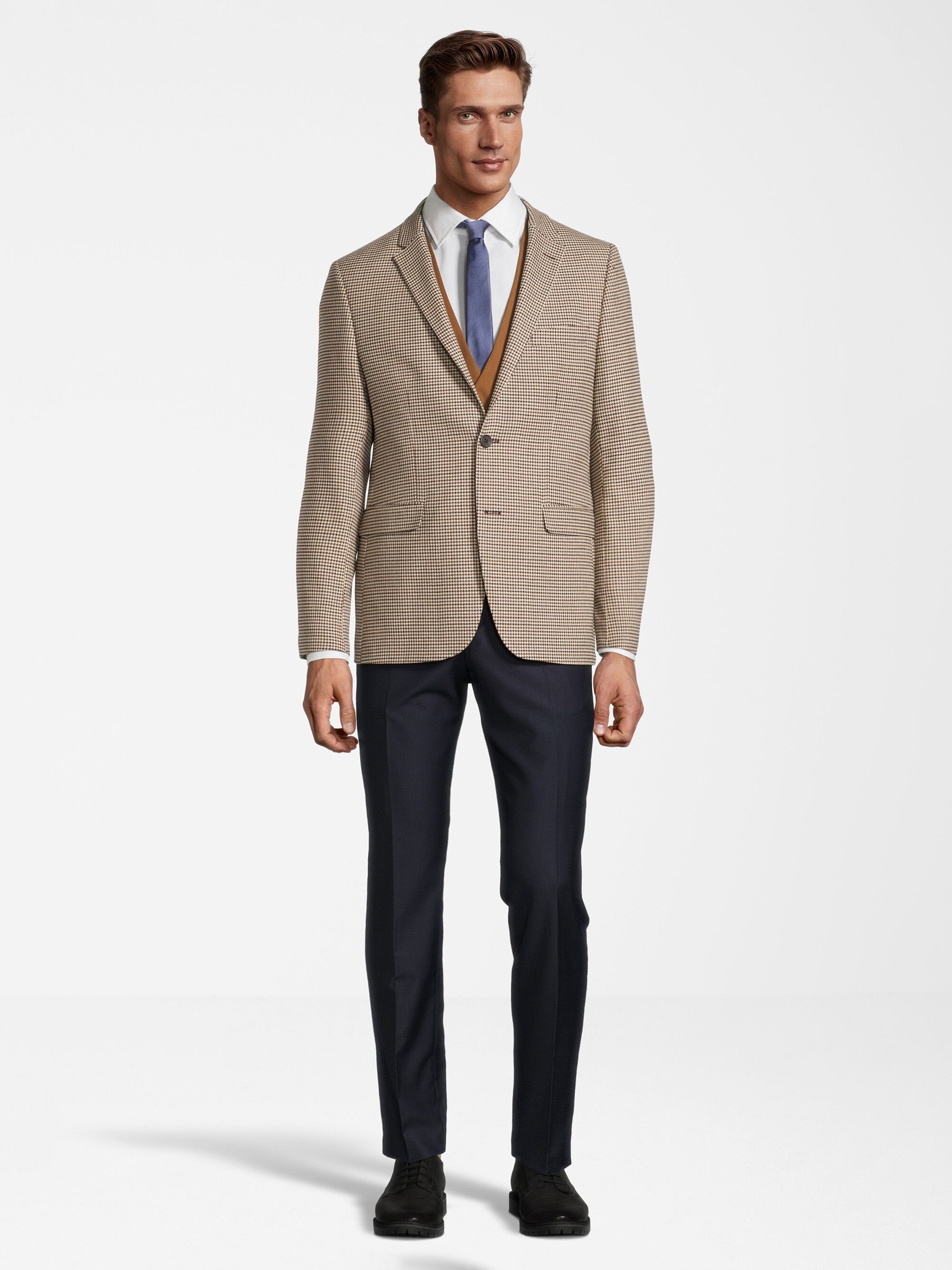 Der elegante 3-teilige Anzug von Steffen Klein vereint einen modernen Schnitt mit klassischen Details. Wer Wert auf das gewisse Etwas legt, liegt mit dem hochwertigen Anzug von Steffen Klein genau richtig. Die Kombination aus kariertem Slim-Fit-Sakko, zweireihiger Weste und schmaler Anzughose ist ein absolutes Must-have im Kleiderschrank eines gepflegten Mannes. Das moderne 2-Knopf-Sakko hat zwei Pattentaschen, eine Leistentasche in Brusthöhe und mehrere praktische Innentaschen. Die elegante Anzughose ist neben bequemen Schubtaschen mit zwei geknöpften Gesäßtaschen ausgestattet. Der Rücken der klassischen Weste ist aus einem hochwertig glänzenden Futterstoff gearbeitet, der höchste Bequemlichkeit unter dem Jackett ermöglicht. Die Anzugweste hat angedeutete Leistentaschen und in der hinteren Taille einen Riegel zur Regulierung der Weite. Die hochwertig verarbeiteten Materialien lassen sich durch den elastischen Stoff sehr komfortabel tragen. Der dreiteilige Anzug ist die perfekte Wahl für besondere Anlässe wie Hochzeit, Familienfest, Taufe, Weihnachten oder Silvester. Auch zu Business-Meetings und beruflichen Terminen macht der klassische Anzug eine gute Figur. Durch die moderne Farbkombination lässt sich der Anzug vielseitig kombinieren.