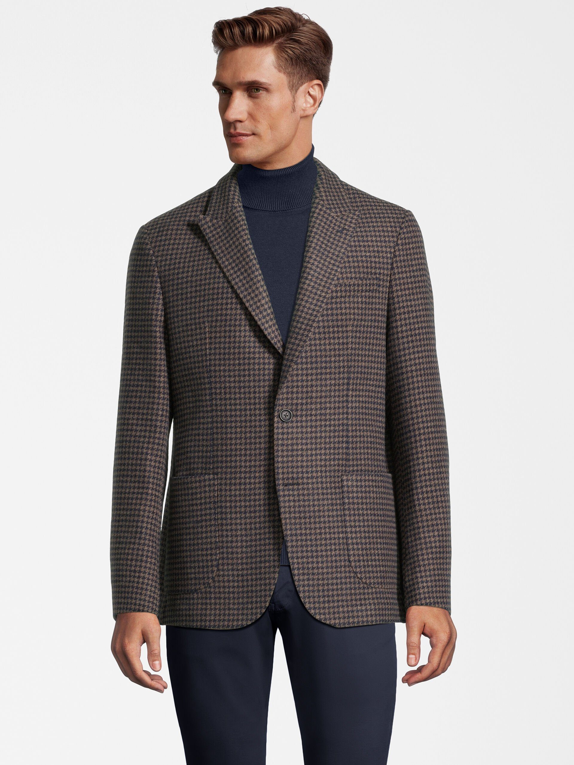 Das moderne Slim-Fit Sakko von Steffen Klein in einem klassischen Muster vereint einen hochwertig verarbeiteten Stoff mit einem eleganten Schnitt. Wer Wert auf das gewisse Etwas legt, liegt mit diesem Herren-Sakko genau richtig. Das moderne Jackett mit klassischen Details ist die perfekte Wahl für Business-Meetings und besondere Anlässe. Der weiche, gemusterte Stoff betont den edlen Look des Jacketts, das mit zwei Knöpfen zu schließen ist. Der Reverskragen und die Brusttasche sind die klassischen Komponenten des Sakkos. Die aufgesetzten Taschen runden das schicke Jackett ab. Das Sakko ist ohne Futter und Schulterpolster gearbeitet und bietet maximalen Tragekomfort. Kombiniert mit einem Hemd überzeugt das Sakko auf jedem Fest wie Hochzeit, Taufe, Weihnachten, Silvester oder der Abi-Feier. Für einen Casual-Look kann der Blazer mit einem T-Shirt und Jeans oder Chinohose leger kombiniert werden. Das Sakko hat ein zeitloses Design und kann vielseitig kombiniert werden.
