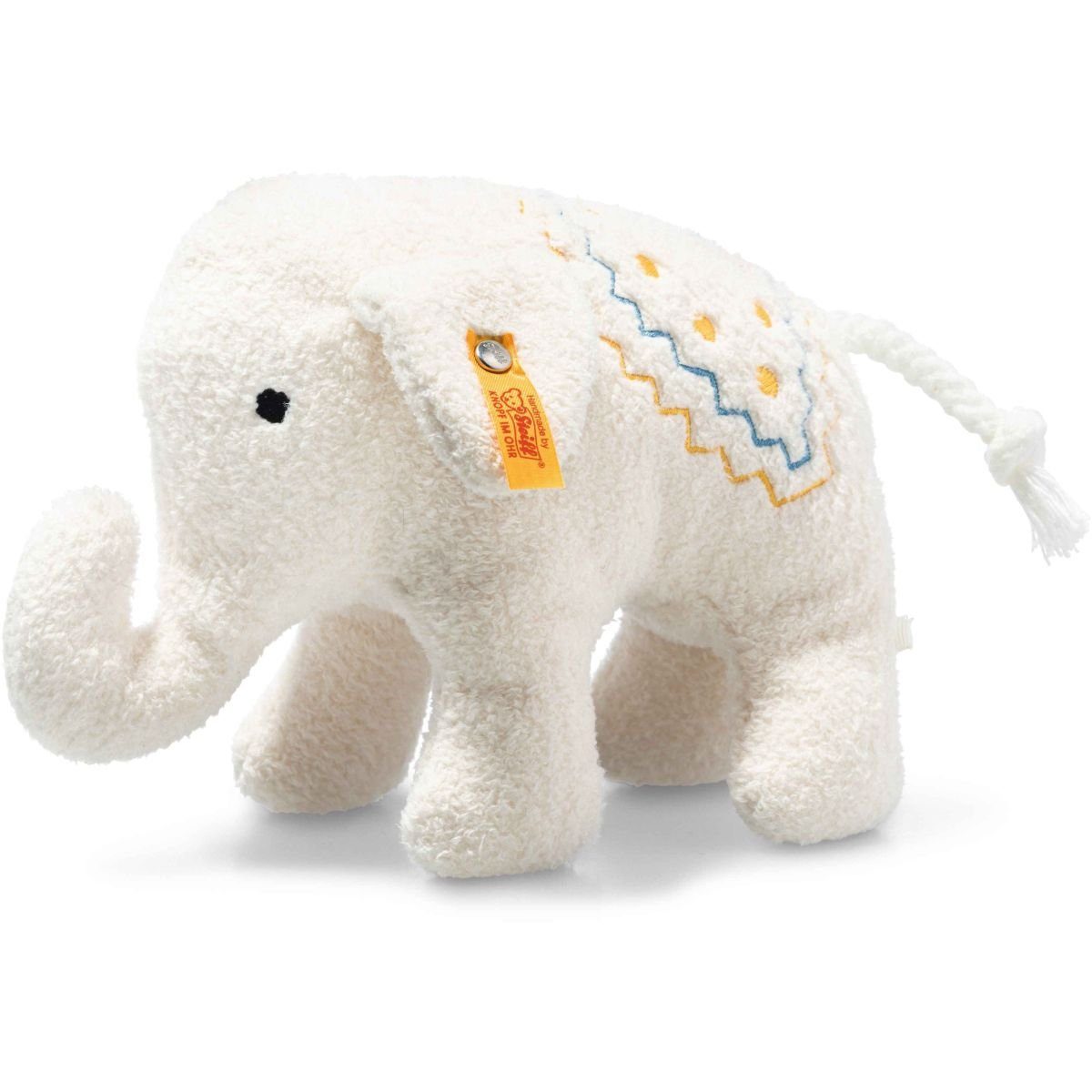 1880 bildet das erste als Spielzeug verkaufte Elefäntle aus der Werkstatt der Margarete Steiff weltweit die Geburtsstunde von Spieltieren aus Plüsch. Das 15 cm große Elefäntle ist passend zur Babyserie auch aus extra feinem cremefarbenen Plüsch gefertigt. Die Satteldecke ist in den Farben Gelb und Blau aufwendig gestickt.