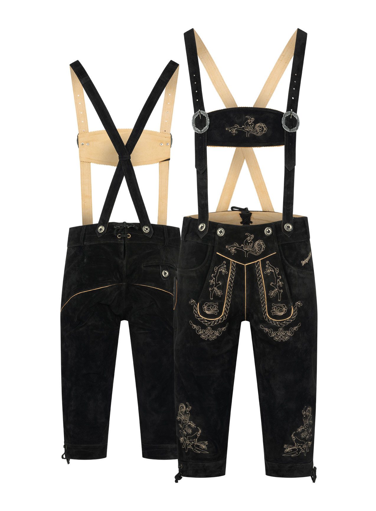 Die Hose ist mit zwei geräumigen Seitentaschen sowie einer verschließbaren Gesäßtasche ausgestattet und bietet somit ausreichend Stauraum für deine wichtigsten Gegenstände. Die feinen, einzigartigen Stickmuster bilden das Highlight dieser Hose, während die rustikalen Knöpfe in Hirschhornoptik und die verzierte Messertasche den authentischen Look abrunden.