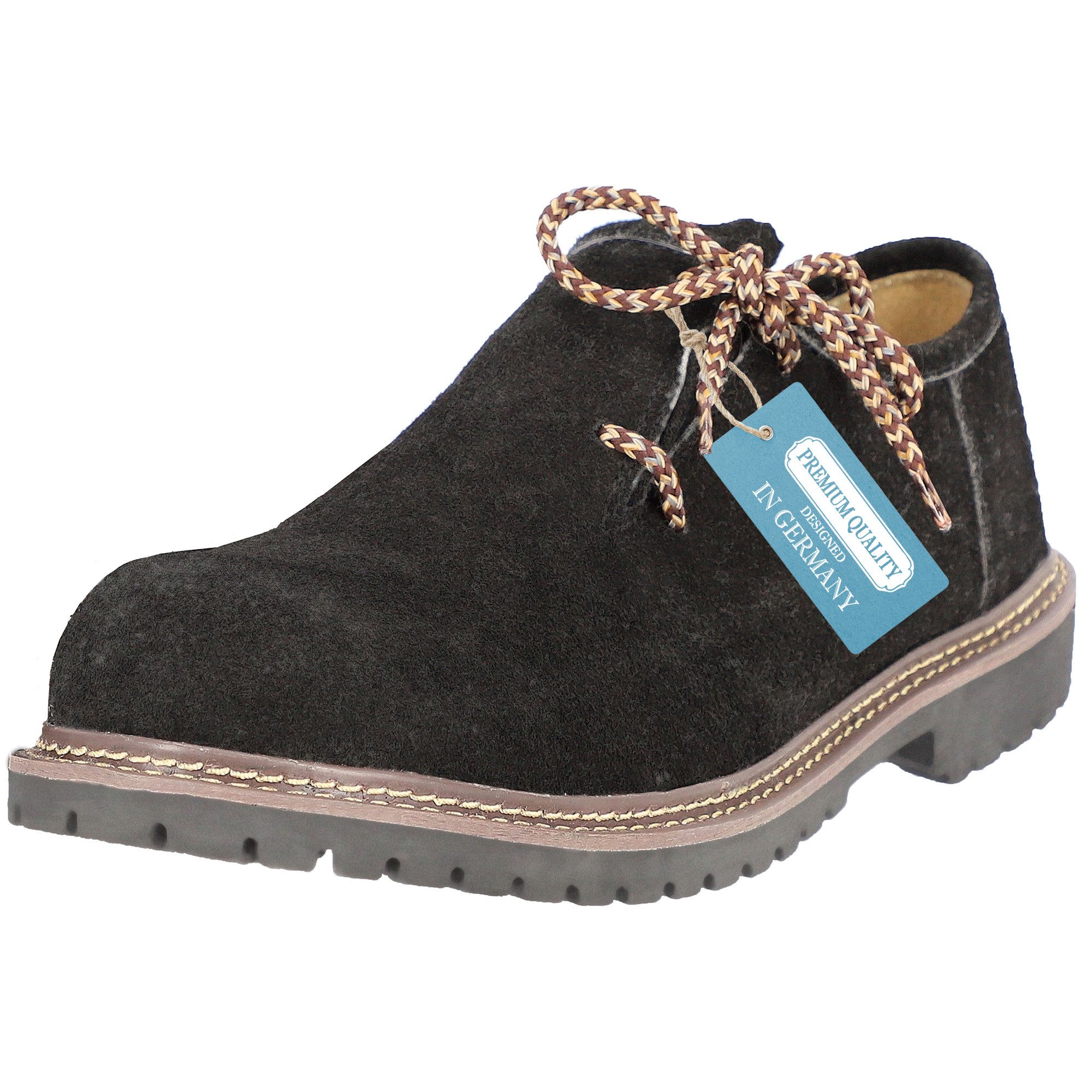 Gefertigt aus 100 % echtem Rinds-Veloursleder bietet das Obermaterial eine angenehme Haptik und einen authentischen, rustikalen Look. Das textile Innenfutter sorgt für ein angenehmes Fußklima – auch an langen Tagen auf der Wiesn, dem Oktoberfest, dem Cannstatter Wasen oder bei der nächsten Bergtour mit Tracht. Die profilierte Gummisohle garantiert festen Stand und guten Grip – ob auf Kopfsteinpflaster, Festzeltbänken oder nassem Gras.