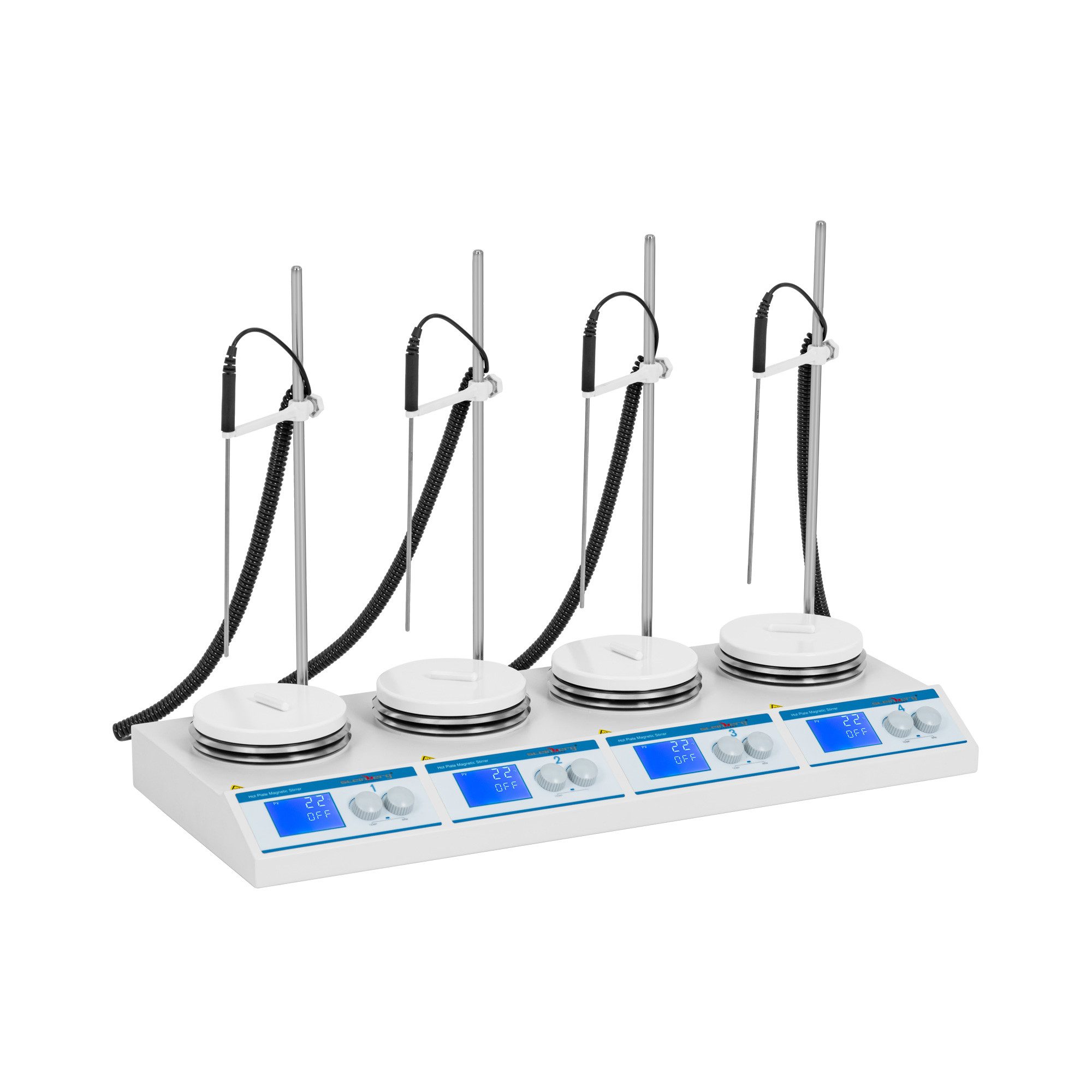 Wenn Sie im Labor viele unterschiedliche Chemikalien oder andere Flüssigkeiten mischen, ist der Magnetrührer von Steinberg Systems das geeignete Werkzeug. Er bietet Ihnen vier Heizplatten, die Sie unabhängig voneinander zum Verrühren und Erhitzen verwenden. Jede Heizplatte ist mit zwei Drehreglern und einem LC-Display versehen. So haben Sie immer alle Werte im Blick. Dank eines wartungsarmen, bürstenlosen Motors und einer effektiven Wärmeableitung überzeugt der Stirrer langfristig durch einen zuverlässigen Betrieb. Dadurch eignet sich dieses Modell für verschiedenste Einsatzbereiche in Laboren unterschiedlicher Branchen sowie in der Forschung.