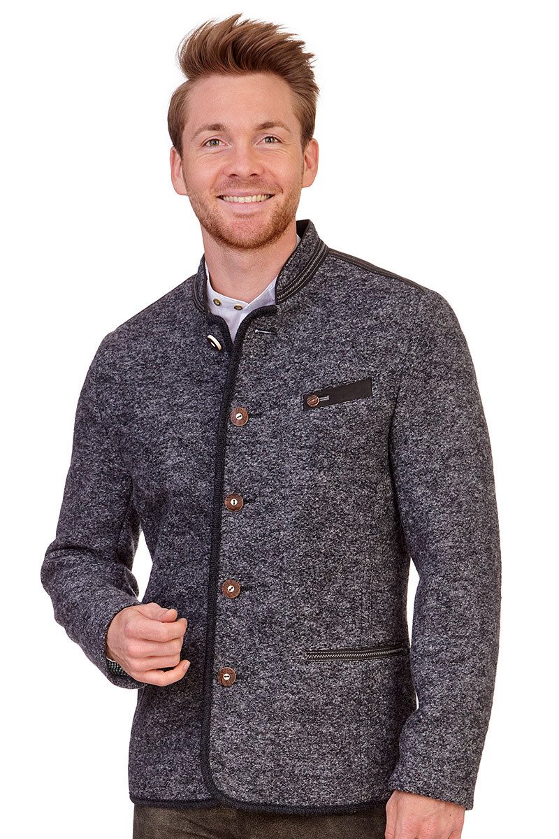 Jabing, der aparte Walk-Janker für Herren im stilvoll-krachigen Design von der Marke Falkenau by Steinbock, ist ein schmucker Klassiker im winterlichen Style. Er besteht aus reiner, kernig im Melange-Look gewalkter Schurwolle mit samtigen Velours-Akzenten und hat urige Beinknöpfe in Hirschhorn-Optik. Die Trachtenjacke im klassischen Janker-Schnitt ist leicht tailliert und die Teilungsnähte vorn sind dezent betont. Feines Veloursmaterial innen verstärkt den traditionellen Stehkragen und ist außen als Paspel sichtbar. Zudem hat der Kragen im unteren Bereich einen Velours-Besatz, der mit feschen Ziernähten, teils im Zickzack-Look, betont ist. Den Schulterbereich hinten schmückt ein schöner Besatz im Velours-Stil und mit kontrastfarbenen Nähten und auch die Ellenbogenbereiche sind mit einem ovalen Velours-Einsatz hervorgehoben. Sowohl die Knopf- als auch die Knopflochleiste sind verstärkt und - ebenso wie der Saum - mit gestricktem Kontraststoff umsäumt. Links gibt es eine Brusttasche mit breiter Velours-Paspel, Zierknopf und angedeutetem Knopfloch. Die beiden Eingrifftaschen vorn mit der einfachen Velours-Paspel sind mit einer Zickzack-Stickerei geschmückt. Innen gibt es links eine Innentasche mit Knopf. Das schöne, angenehme Innenfutter im Karo-Look sorgt für einen tollen Tragekomfort. Dieser Janker passt fantastisch zu Lederhose und Trachtenjeans. Bitte beachten Sie die Übergrößenzuschläge ab Размер 28 bzw. 58.