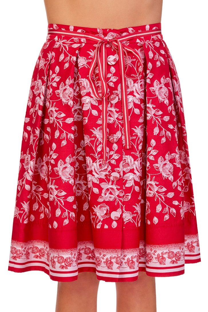 Der romantische Trachtenrock Larella in beerigem Rot mit tollem Rosen-Muster kommt unglaublich zauberhaft daher. Diese hochwertige Kreation mit Baumwoll-Anteil von der Trachtenmarke Steinbock ist ausgestellt in A-Linie mit schönen Kellerfalten gearbeitet und hat ein stilvolles Webmuster mit schmucken Rosen-Arrangements. Der Damenrock hat vorn einen doppelten Verschluss mit Haken und Knopf am Bund, der mit einer Borte mit Lurex verziert ist, und eine durchgängige Knopfleiste mit großen, stoffbezogenen Knöpfen. Die Borte ist vorn verlängert und wird zu einer schönen Schleife gebunden. Den Rocksaum zieren ein harmonisches Kontrastmuster in umgekehrter Farbgebung und Streifen. Dieses elegante Exemplar lässt sich fantastisch mit Trachtenbluse, Body und Trachtenshirt kombinieren.