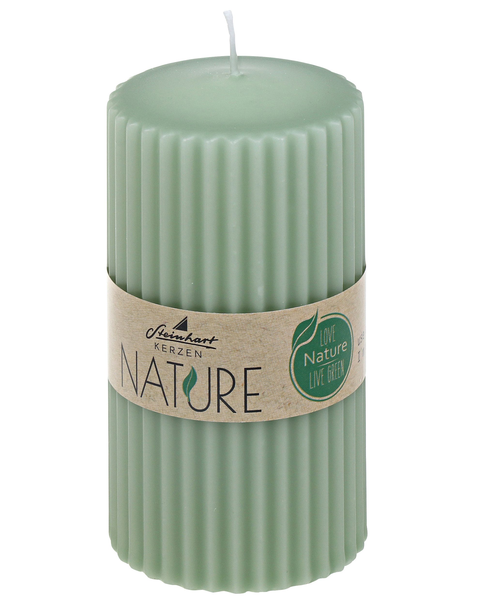 Die modernen Rillenkerzen (Stumpenkerzen) der Serie Nature in Salbei (110 x Ø 57 mm) von Steinhart Kerzen werden aus nachhaltigem Rapswachs hergestellt. Palmölfrei, fördern sie den Schutz der Regenwälder und setzen ein Zeichen für Umweltbewusstsein. Die Brenndauer beträgt 35 Stunden.