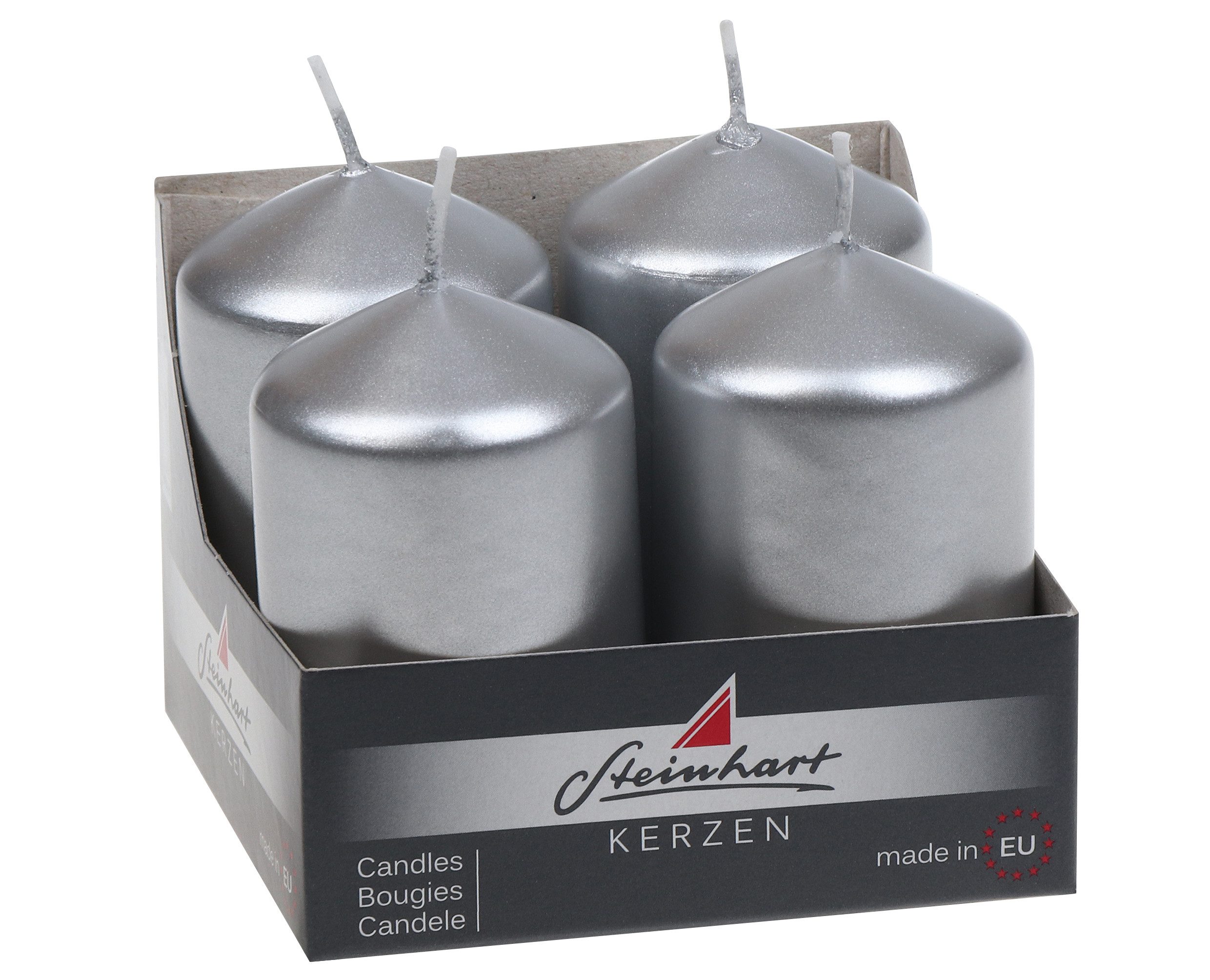Stumpenkerzen Edelglanz in Silber (65/40mm) von Steinhart Kerzen, hergestellt in Deutschland in geprüfter RAL-Kerzengüte-Qualität. Die farblich glänzend lackierte Oberfläche, getauchten Kerzen sind im 4er-Pack erhältlich und bieten eine Brenndauer von 10 Stunden
