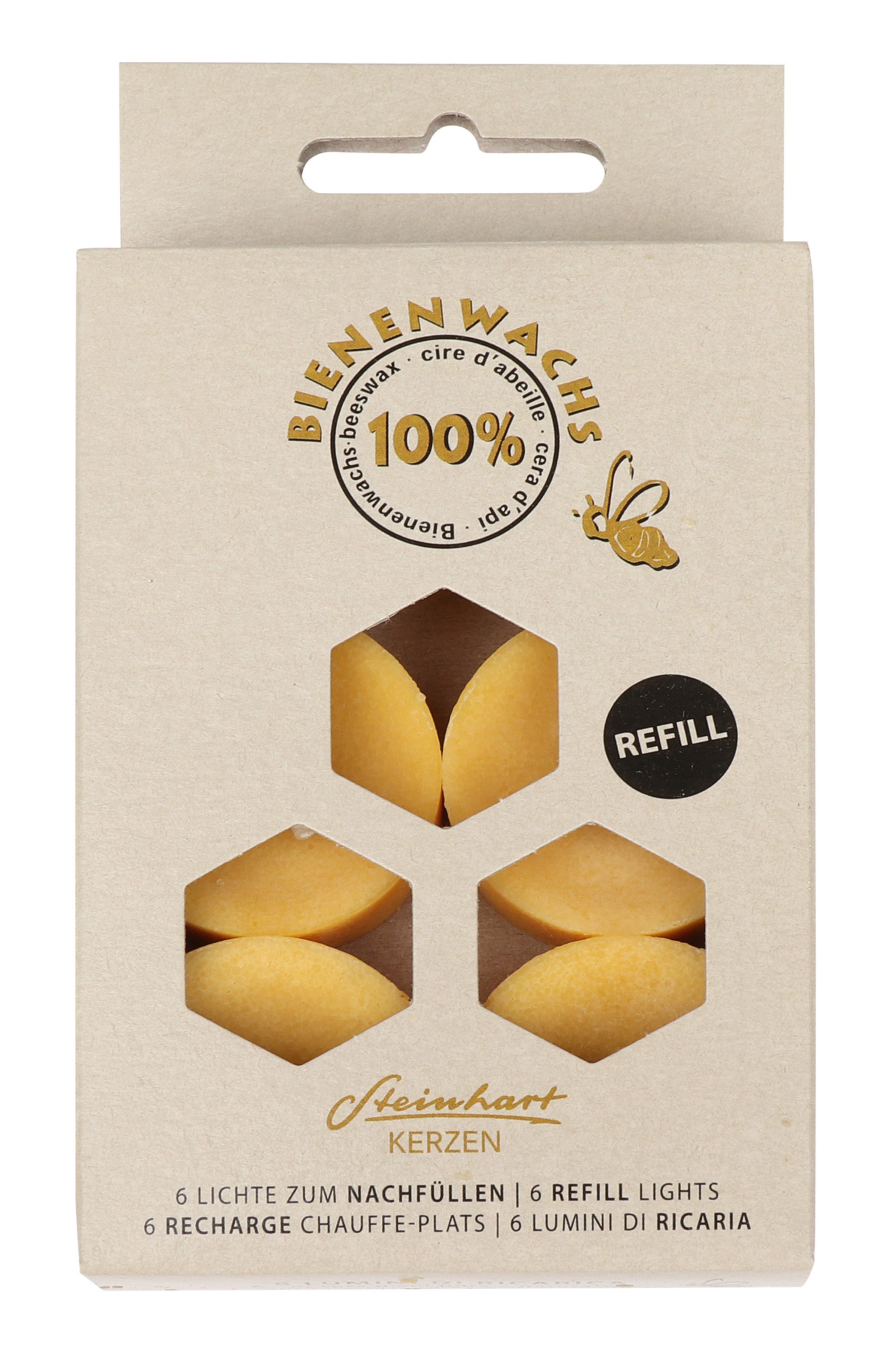 Die Refill-Lichter „100% Bienenwachs“ im 6er-Pack (18/38 mm) in Honig bieten mit einer Brenndauer von 3 Stunden eine gemütliche Atmosphäre. Refill-Teelichter nachhaltig zum Nachüllen (ohne Hülle) für Ihr Teelicht aus Glas oder Plastik-Cup.