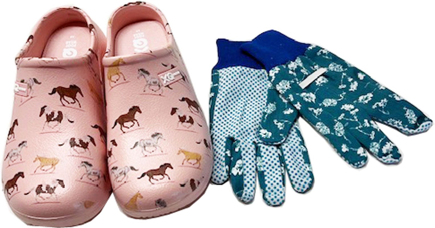 Egal ob als Freizeitschuh, Badeschuh oder Gartenschuh. Diese Damen Clogs mit den passenden Gartenhandschuhen mit Pferdemotiv in rosa sind federleicht und haben einen tollen Tragekomfort. Die Sohle ist glatt und ebenfalls rosa. Der Gartenschuh ist gemütlich und vor allem Rutschfest. Ein idealer Gartenschuh für jedes Wetter. Die Sohle bei diesem Gartenschuh ist eine glatt. Nicht nur für Gartenliebhaber auch für Pferdeliebhaber. Perfekt für den Pferdestall.