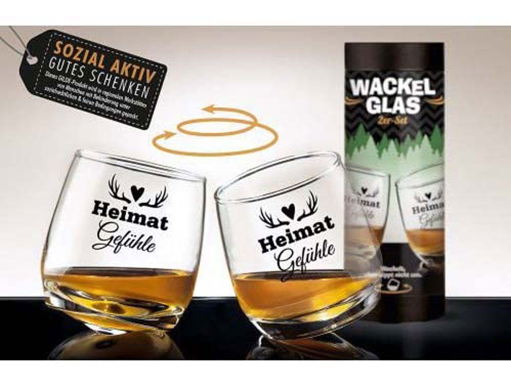 Zwei ausgefallene Gläser mit rundem, kugelförmigen Boden. Auf den Gläsern steht Heimatgefühle mit einem Geweih darüber. Geliefert werden die Gläser in einer hochwertigen Geschenkbox mit Banderole.