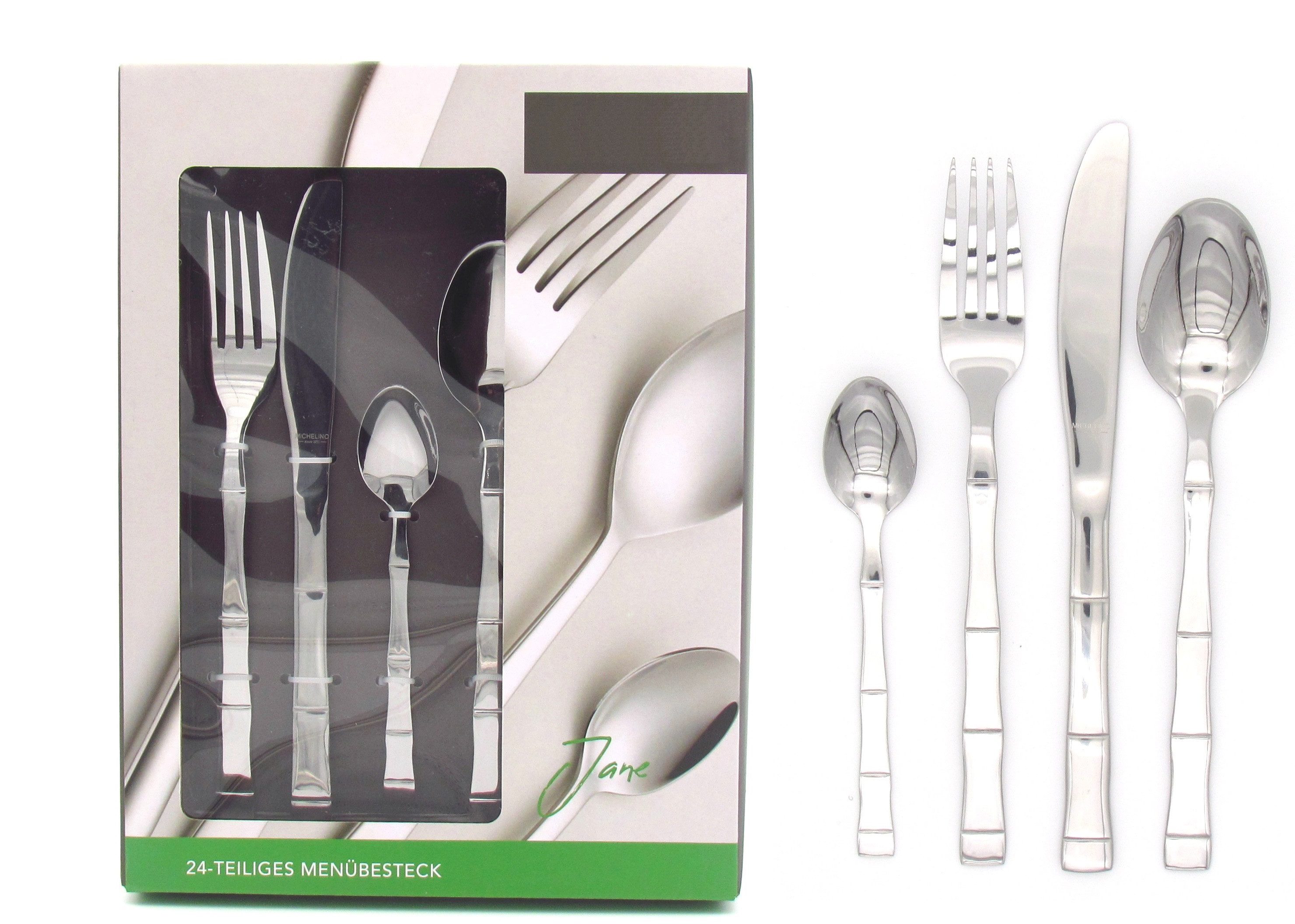 KOMPLETTES 24-TEILIGES SET – Ideal für 6 Personen: Jeweils 6 Menügabeln (21 cm), 6 Menümesser (23 cm), 6 Menülöffel (21 cm) und 6 Kaffeelöffel (14 cm)