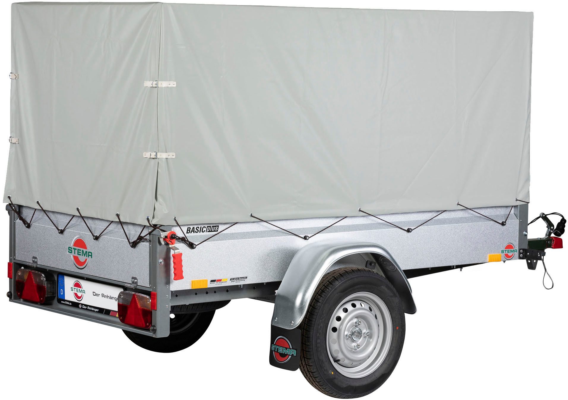 Der Stema Anhänger Basic 750 mit Kippdeichsel ist ein ungebremster Tieflader und Einachser mit einem maximal zulässigen Gesamtgewicht von 750 kg und einer Nutzlast von 593 kg.