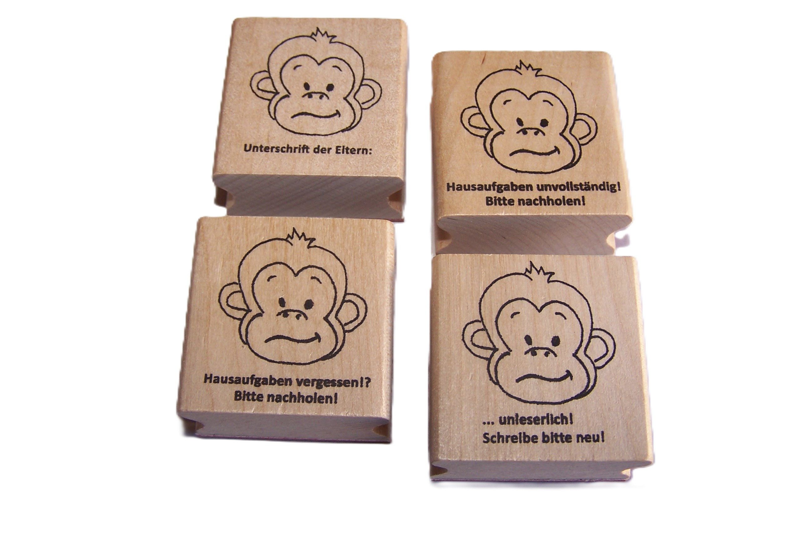 Dieses Lehrerstempel Set besteht aus 4 Motivstempeln, Affenstempel, (jeder Stempel hat von oben gesehen jeweils eine Размер von ca. 4 x 4 cm und eine Höhe von ca. 2,3 cm - die Stempel lassen sich gut fassen und handhaben und in der mitgelieferten Schachtel gut aufbewahren - die abgebildete Motivgröße entspricht der Originalgröße des Motivs. Hier haben Lehrer und Pädagogen viele unterschiedliche Motive zur Bewertung oder zur Motivation (unterstützt mit den Schriftzügen: Hausaufgaben unvollständig! Bitte nachholen! - Hausaufgaben vergessen!? Bitte nachholen! - Unterschrift der Eltern: -.unleserlich! Schreibe bitte !) zur Verfügung - für die Grundschule als auch für die Sekundarstufe sind diese Stempel sehr gut geeignet, besonders natürlich auch dann, wenn man eine sogenannte Affengruppe oder Affenklasse hat. Die Stempel eigenen sich auch zu Erleichterung der eigenen Arbeit in der Schule, man muss nun nicht immer wieder die Aufforderungen selbst schreiben :) TIPPS ZUM STEMPELN: Am Besten ist es, wenn man das Stempelkissen in die eine und den Stempel in die andere Hand nimmt und dann den Stempel mit dem Stempelkissen betupft. So kann man genau sehen, ob das Motiv eingefärbt ist. Drückt man den Stempel in das Stempelkissen, wie es vielfach gemacht, hat man oft zu viel Tinte auf dem Stempel. Beim Drucken mit der Handfläche gleichmäßig leicht Druck ausüben. Nicht zu feste drücken - dann wird der Druck überzeichnet. Mit ein wenig Übung klappt es richtig gut - ich wünsche VIEL FREUDE BEIM STEMPELN :)
