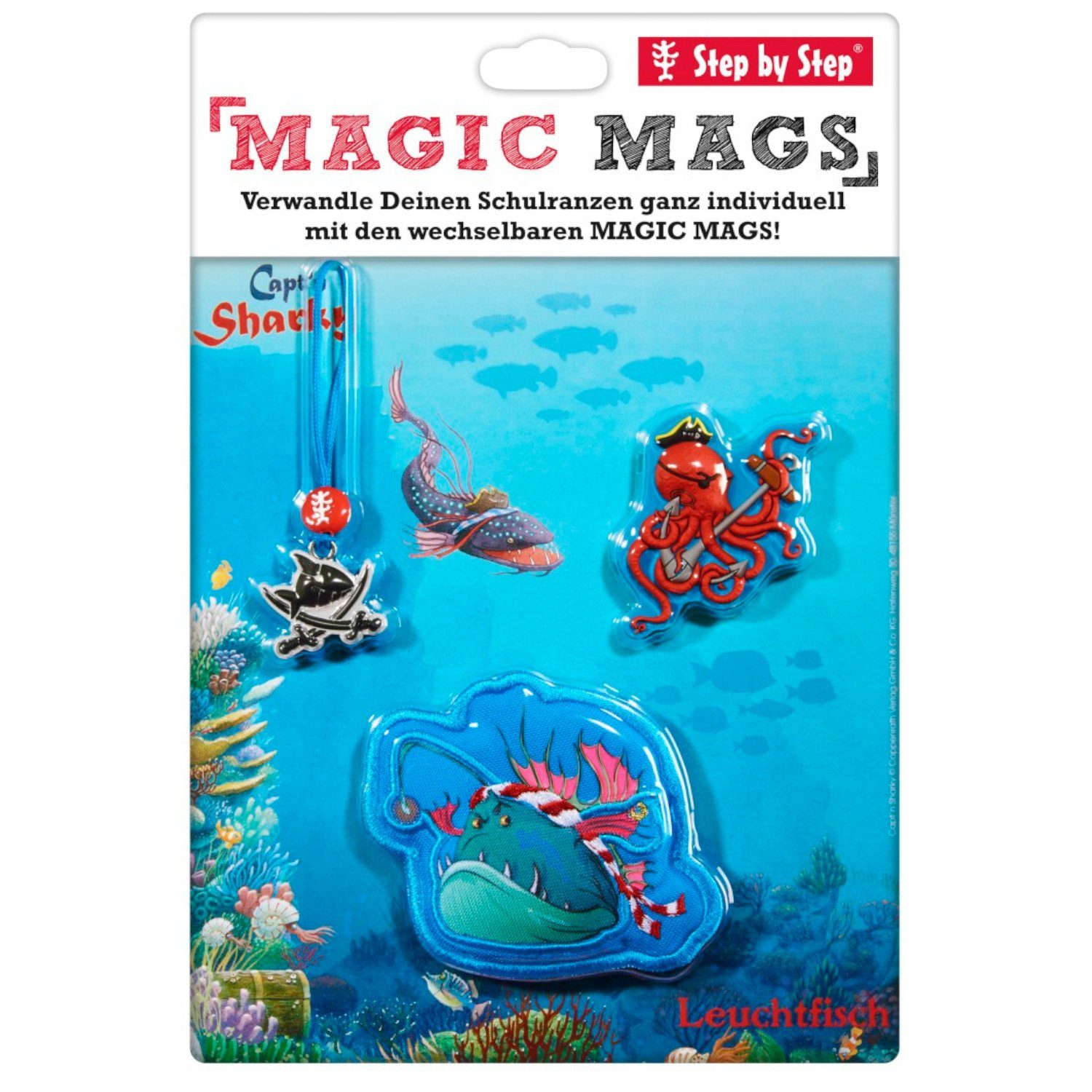 Exklusives Spiegelburg-Zuberhör-Set zum Wechsel der Applikationen an deinem Step by Step Schulranzen. Mit den Step by Step Magic Mags Spiegelburg Capt'n Sharky Leuchtfisch verwandelst du im Nu deinen Schulranzen in eine originelle Themenwelt. Oftmals ändert sich im Laufe der Grundschulzeit das Traummotiv. Die Step by Step Magic Mags ermöglichen eine einfache Umgestaltung deines Ranzens. Jedes Set besteht aus zwei bunten Applikationen zur Befestigung an den Magnetflächen deines Schulranzens sowie ein ebenso austauschbarer cooler Anhänger. Hierfür sind am Ranzen Step by Step im Deckel und in der Front starke Magnete eingebaut. An diesen haften die Magic Mags Spiegelburg Capt'n Sharky Leuchtfisch. Die Applikationen lassen sich rückstandsfrei abnehmen und wechseln. Geliefert werden die Magic Mags in vielen weiteren Mädchen- und Jungen-Motiven. Sie lassen sich tauschen und sammeln.