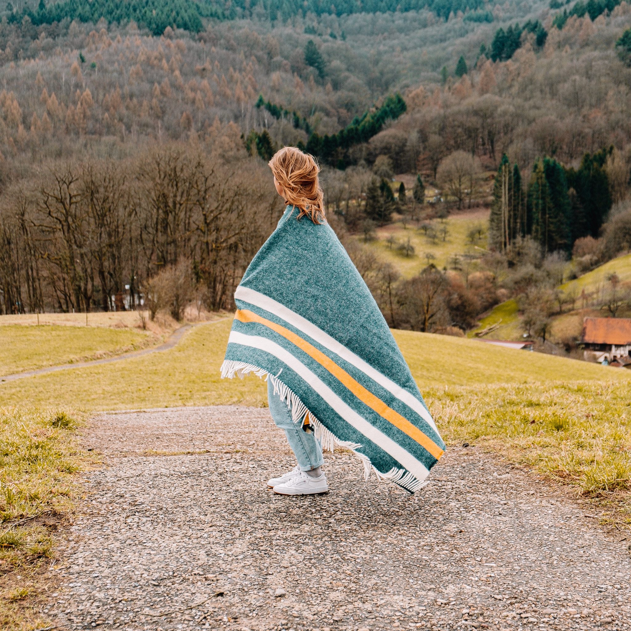 Unsere grüne Wolldecke mit weißen Streifen ist im Wald bestens getarnt. Sie ist natürlich ökologisch und aus 100% reiner Schurwolle gefertigt. Die kräftigen Farben und wilden Fransen verleihen der kuschelig warmen Decke einen besonders schönen Naturcharakter.