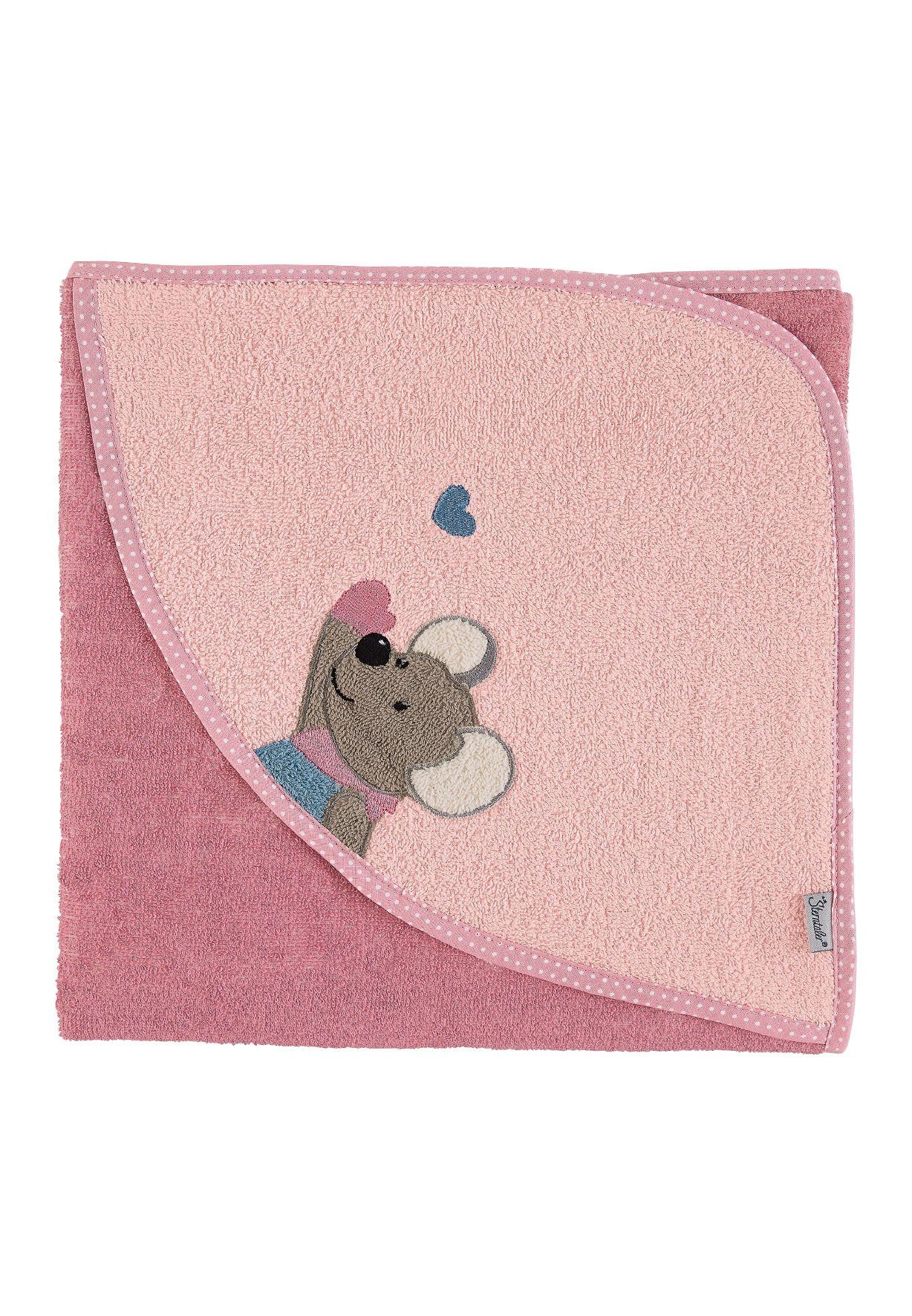 Kapuzen-Badetuch aus weichem Frottee mit appliziertem Stickmotiv Maus Mabel. Die Kuschelgarantie nach dem Baden. Größe: 80 x 80 cm