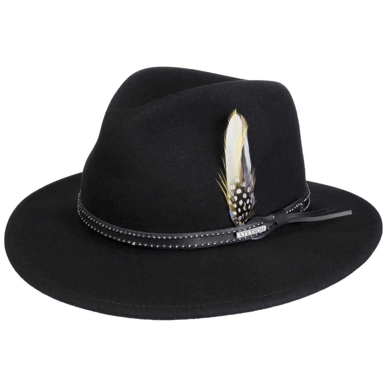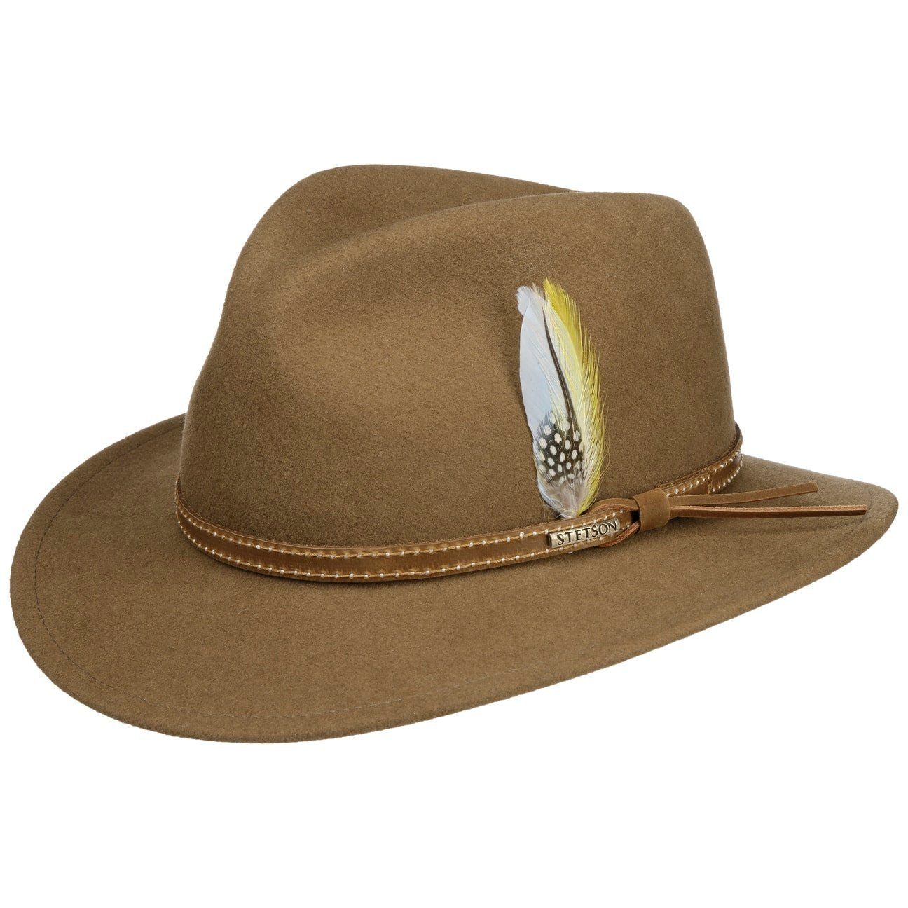Auf Reisen gut behütet. Der zu 100% aus Wolle in Handarbeit gefertigte Traveller von Stetson ist ein Must-have für modebewusste Reisende. Federn sowie ein dekoratives Ledergarniturband mit Kontrastnähten schmücken das unifarbene Modell. Dank VitaFelt-Finish ist der knautschbare Filzhut wasser- und schmutzabweisend. Er lässt sich einfach platzsparend im Reisegepäck verstauen und schützt den Kopf bei Wind und Wetter. Hergestellt in den USA, mit Label-Applikation aus Metall.